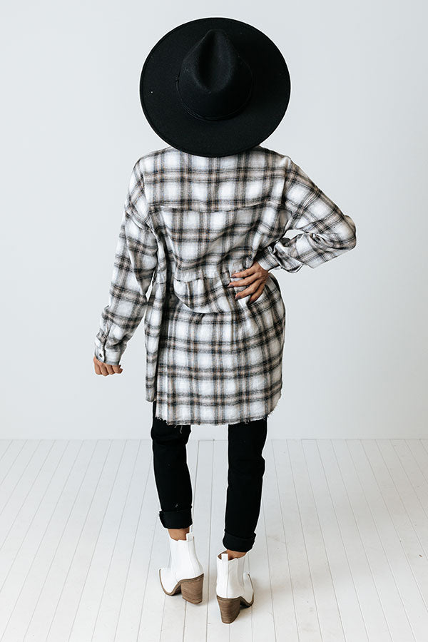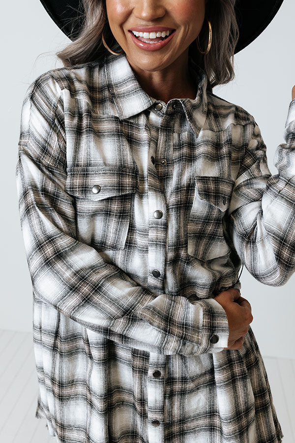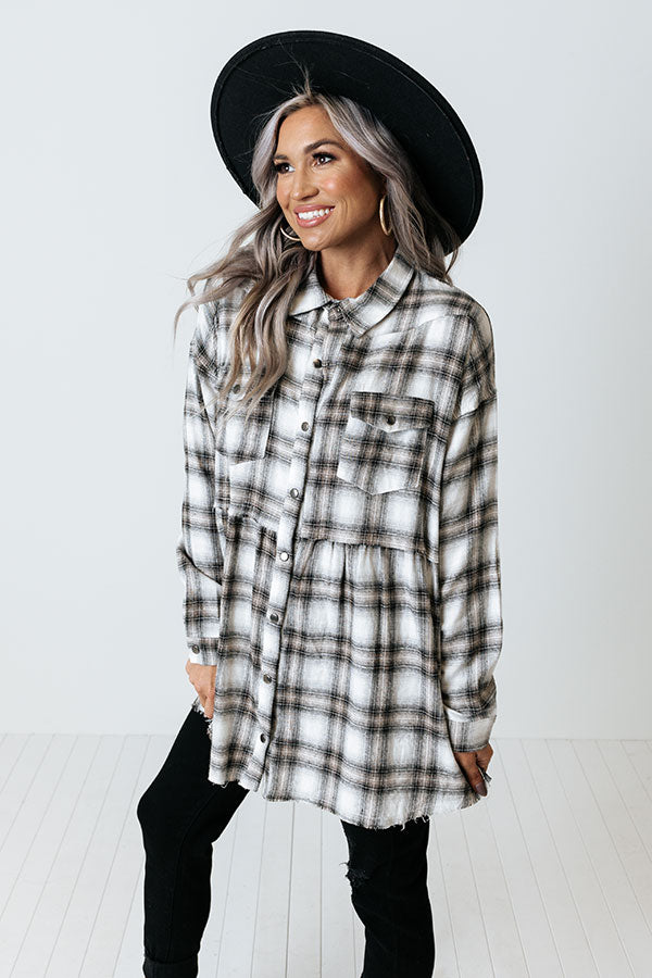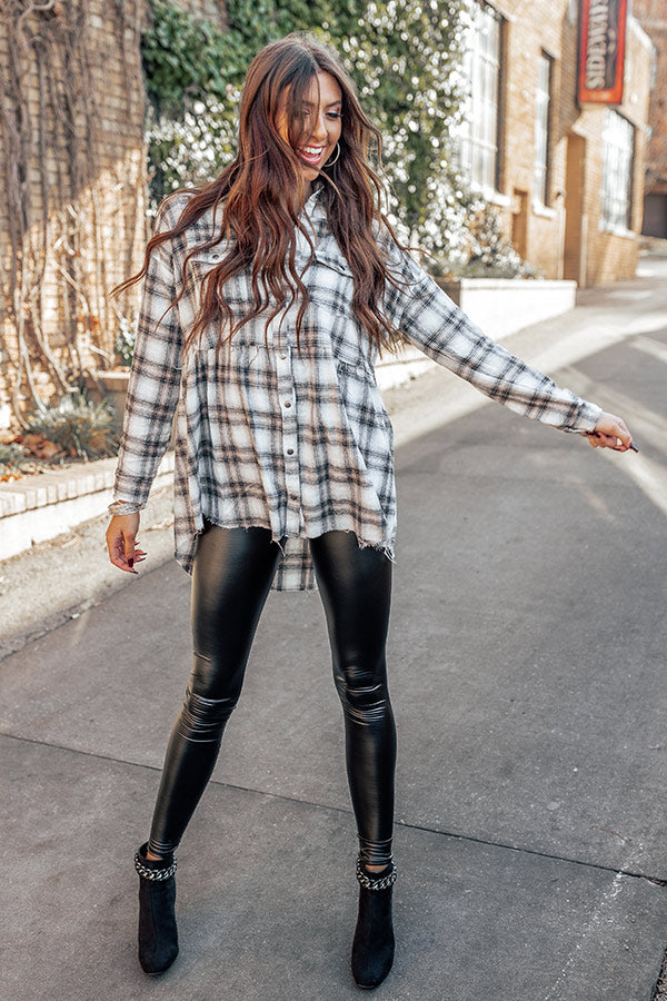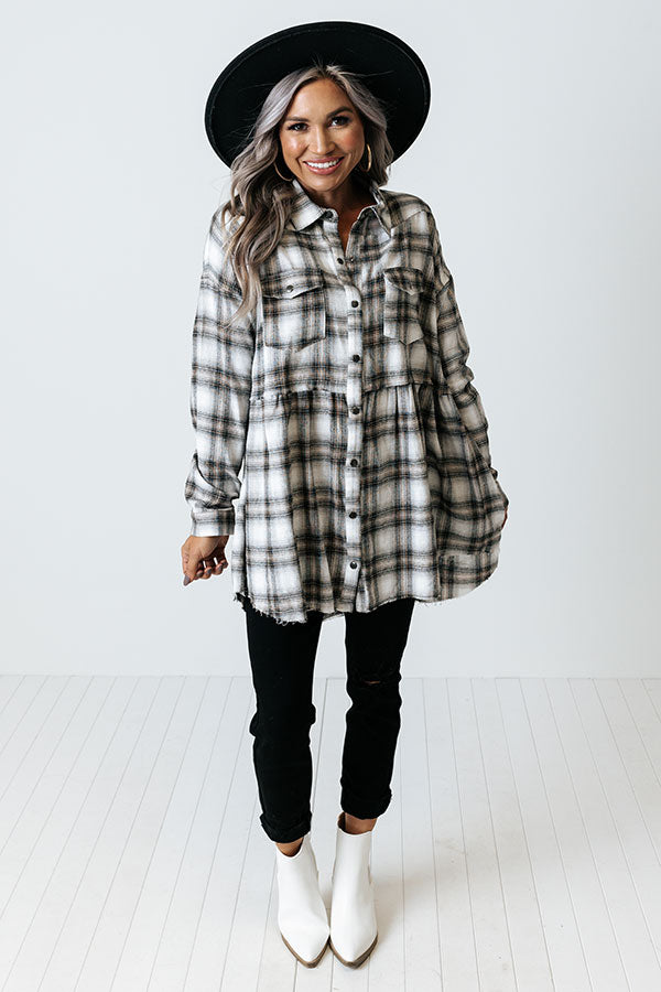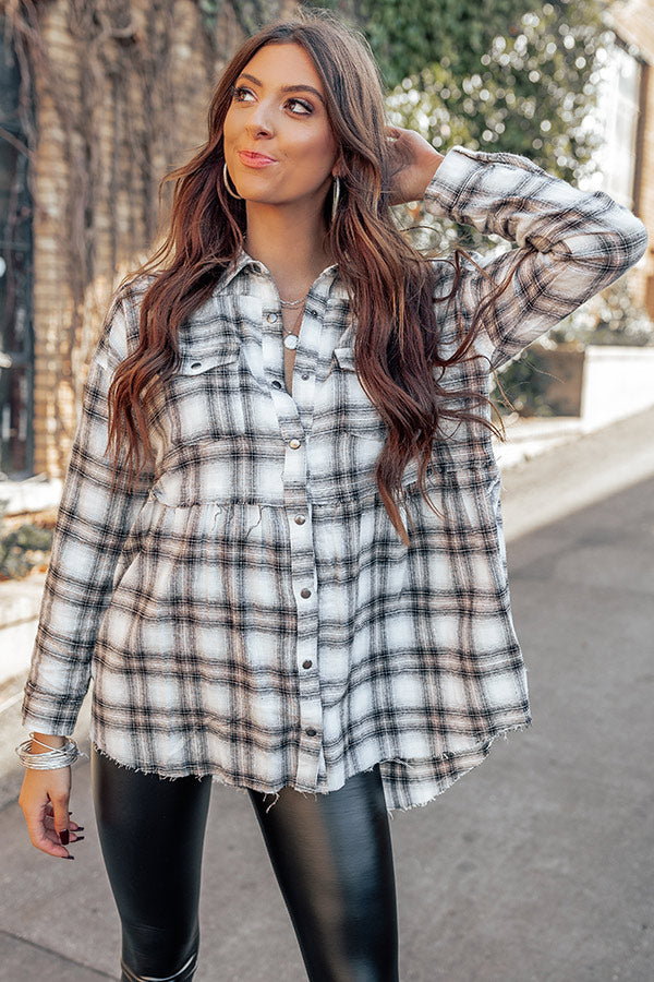 You are sure to look pretty in plaid when you wear our trendy 'Latte Kinda Day' top featuring warm black and white plaid material, a button down front with a collared neckline, long loose sleeves with button closure cuffs, two chest pockets with flap closures, and a relaxed silhouette that falls into a rounded hemline! Measurements