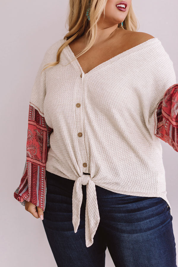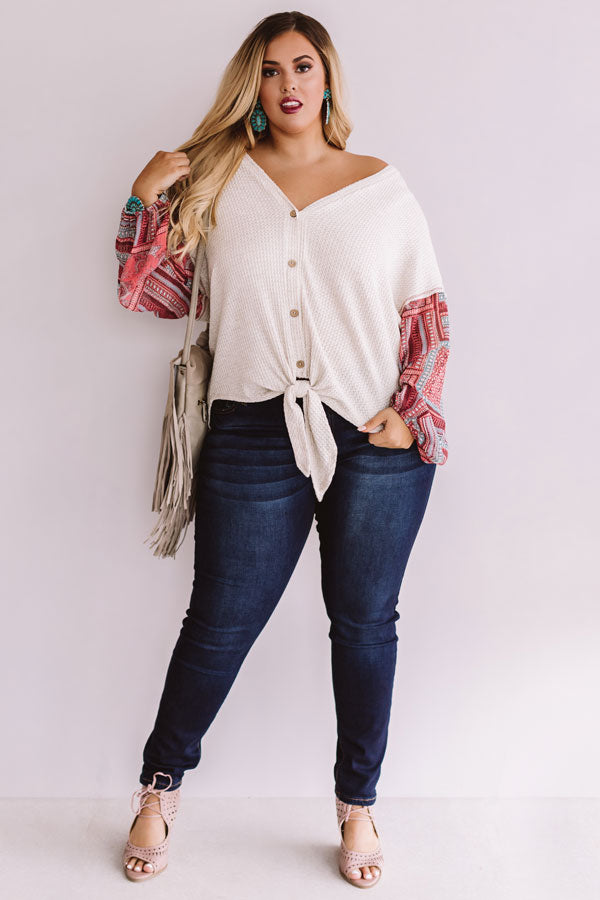 Plus Size - Latte run and stun in this pink shift top featuring a v-cut neckline, a lightweight waffle knit bodice accented with faux wooden buttons, long polyester printed sleeves, and a trendy tie-front hem! You can style this piece with some distressed denim and neutral booties or you can swap the booties for some over-the-knee boots, a jacket, and a beanie for an effortlessly stylish fall look that is sure to be stunning!