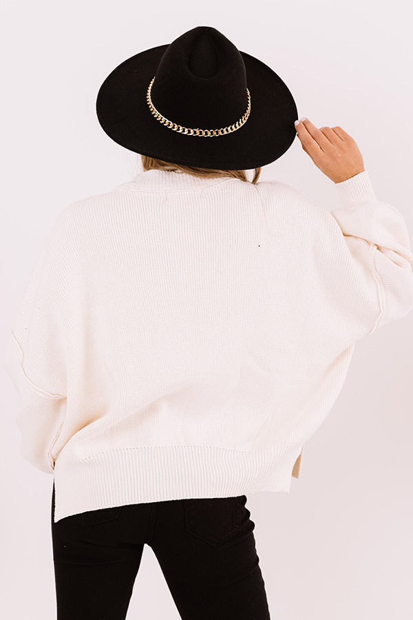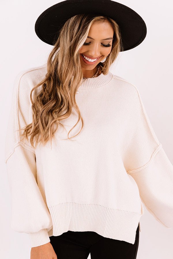 This simple but stylish cream colored sweater is sure to bring a smile to your face with its soft lightweight tight knit material with subtle vertical ribbed detailing, a high rounded neckline, long oversized sleeves with fitted cuffs, exposed accent seams, and an ultra slouched but flattering silhouette that falls into a wide straight hemline with side slits! Measurements