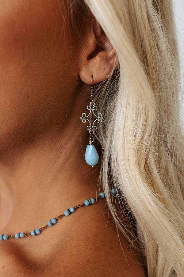 Our gorgeous 'Latte To Go Earrings' feature beautiful dangling vintage bronze metal work with a sky blue teardrop bead accent!
