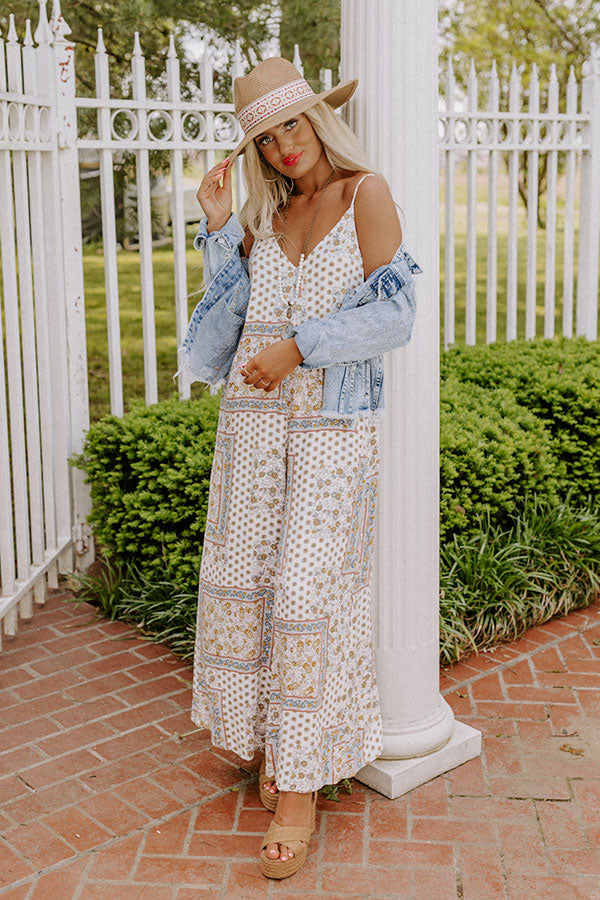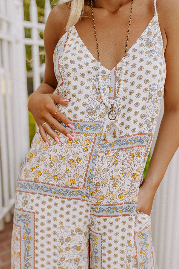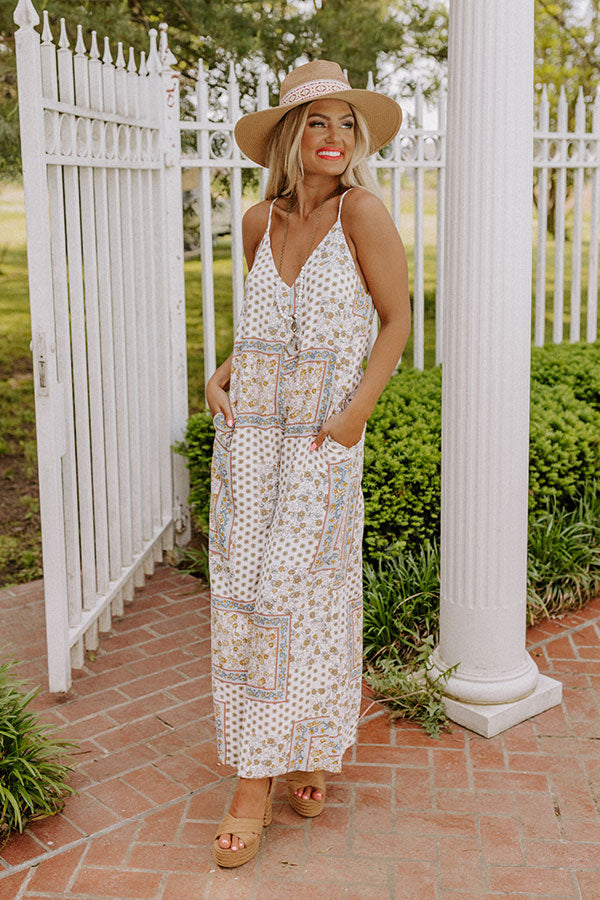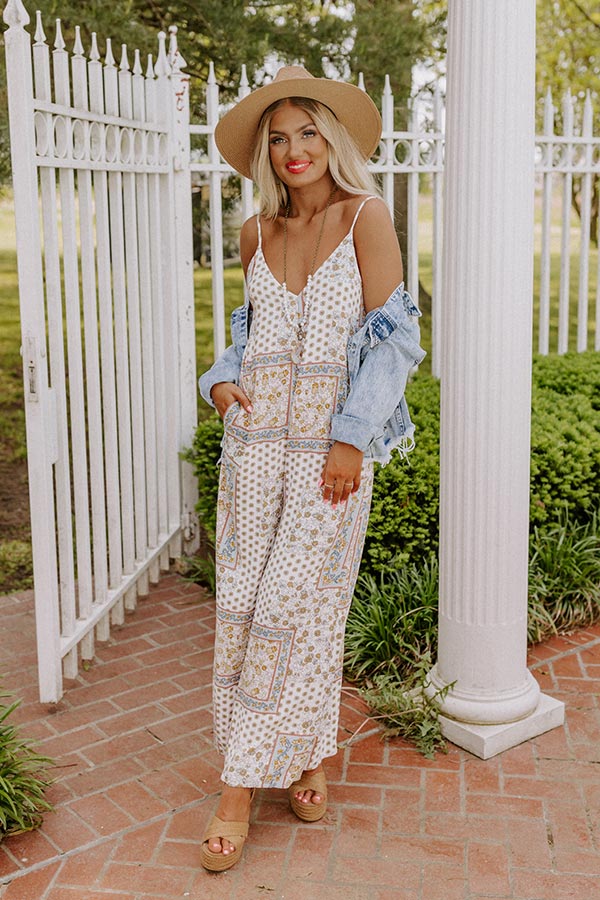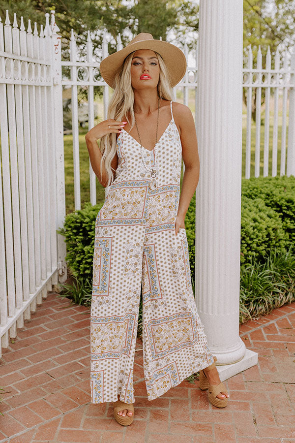 Step out in style with our pretty white 'Latte To Go Jumpsuit' featuring lightweight breezy material patterned with an intricate floral print, a v-cut neckline and upper back with adjustable spaghettis traps, hidden side pockets, and a slouched but flattering silhouette that falls into straight ankle-length hemlines!