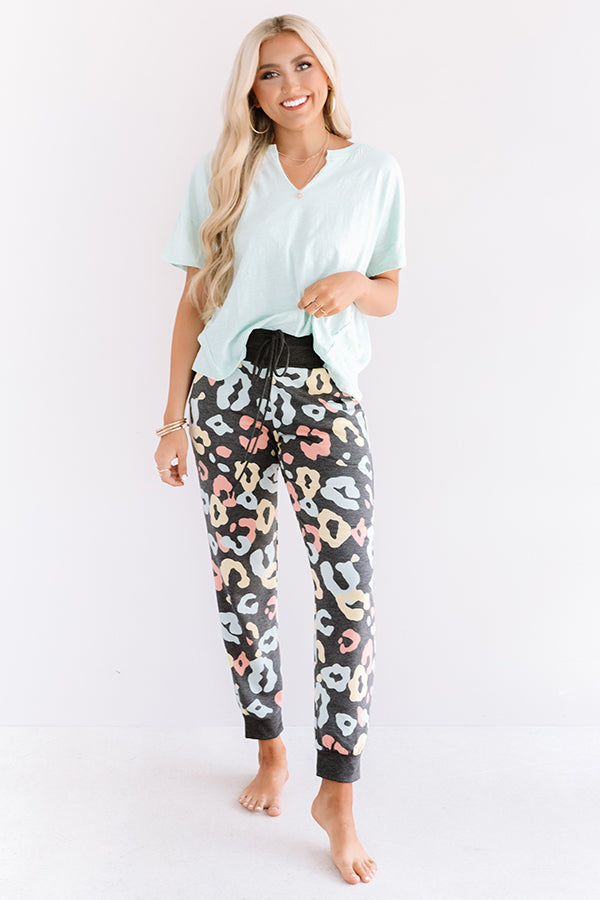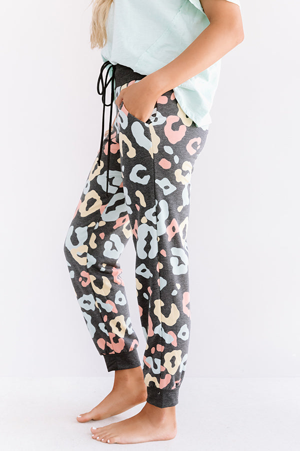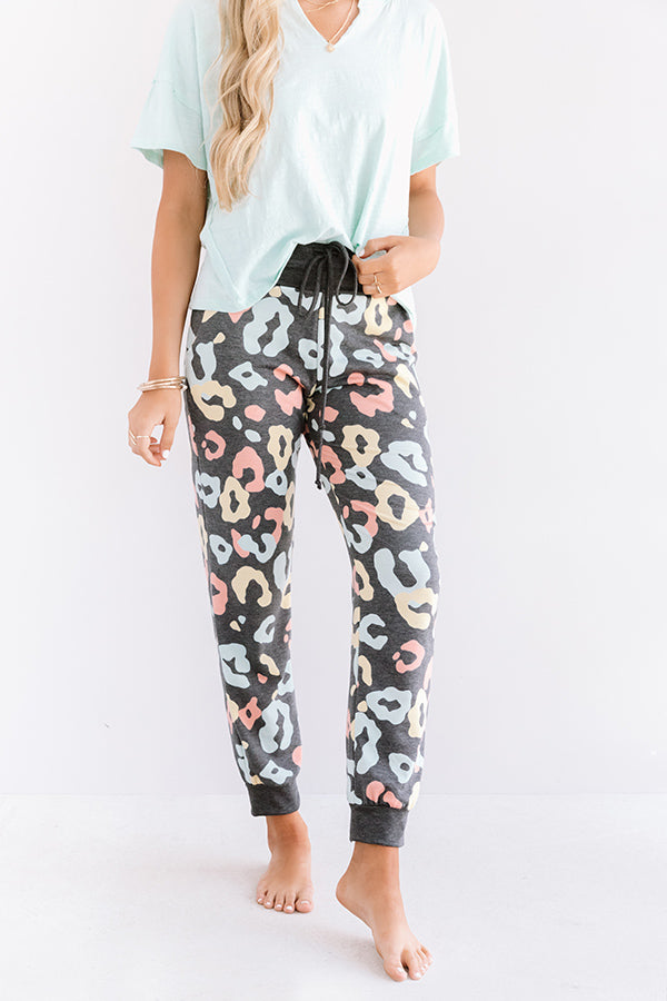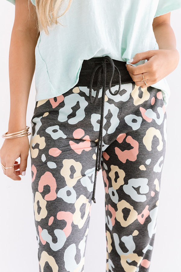 Snuggle up in style with our darling charcoal colored "Lattes And Lounge" joggers featuring soft lightweight material patterned with a large colorful leopard print, a wide elastic waistline with a tie belt, accent side pockets, and a relaxed pants silhouette that falls into fitted ankle length hemlines! This comfy piece pairs perfectly with our matching "Lattes And Lounge Leopard Shift Tee in Charcoal," a scrunchie, and some fuzzy slippers for the ultimate two piece lounge look! Measurements