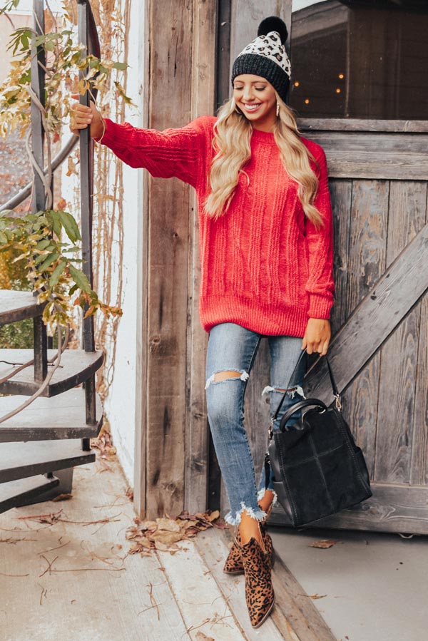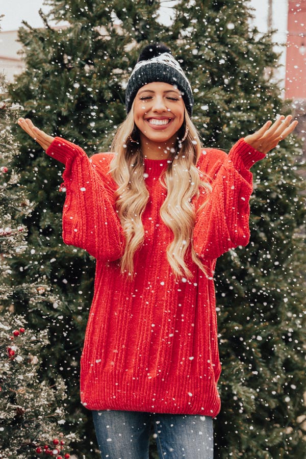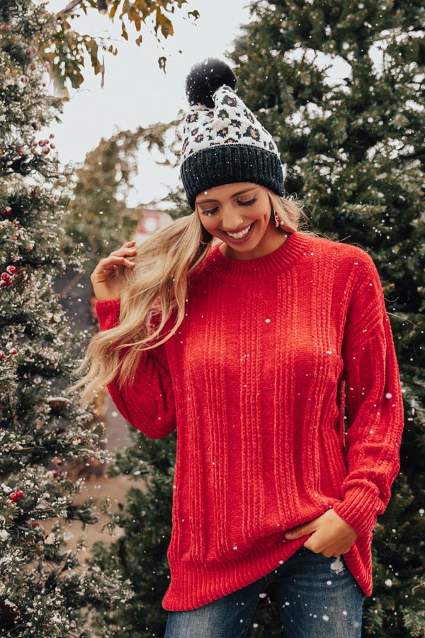"Tis the season for "lattes and snuggles!" This raspberry colored sweater is the perfect cozy fall piece with its soft lightweight chenille material with wide cable knit texturing, a high rounded neckline, long loose sleeves with fitted cuffs, and relaxed silhouette that falls into a straight tunic length ribbed hemline! This piece can be styled with some distressed ankle skinnies, a black backpack, and a leopard bootie and beanie, or you can wear it front tucked into some charcoal flares with "The Seraphina Faux Leather Wedge in Grey!" Measurements