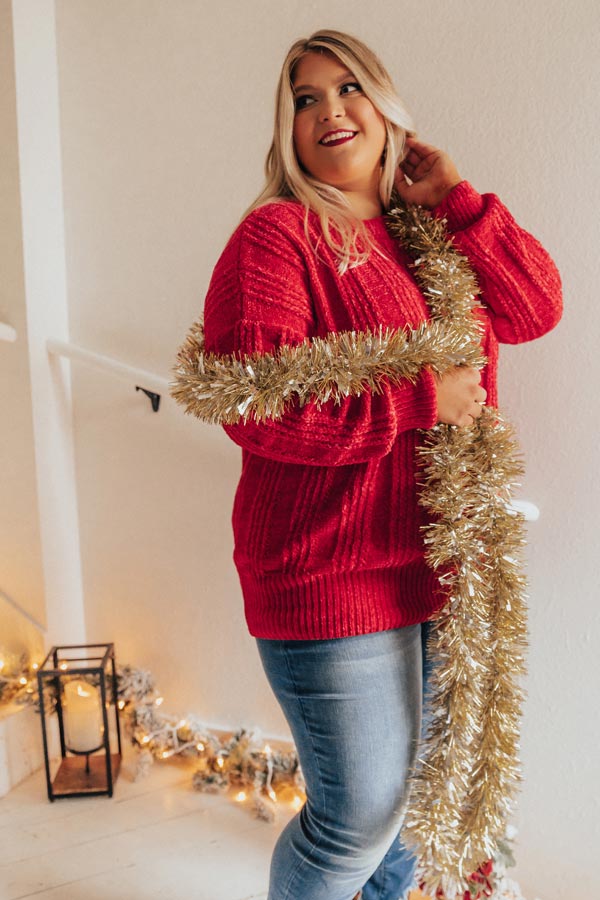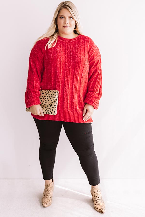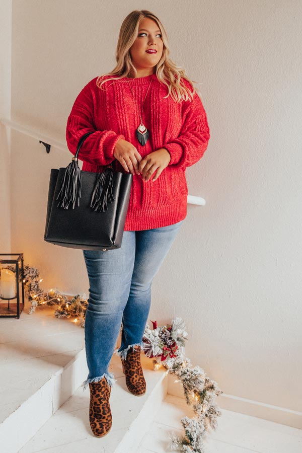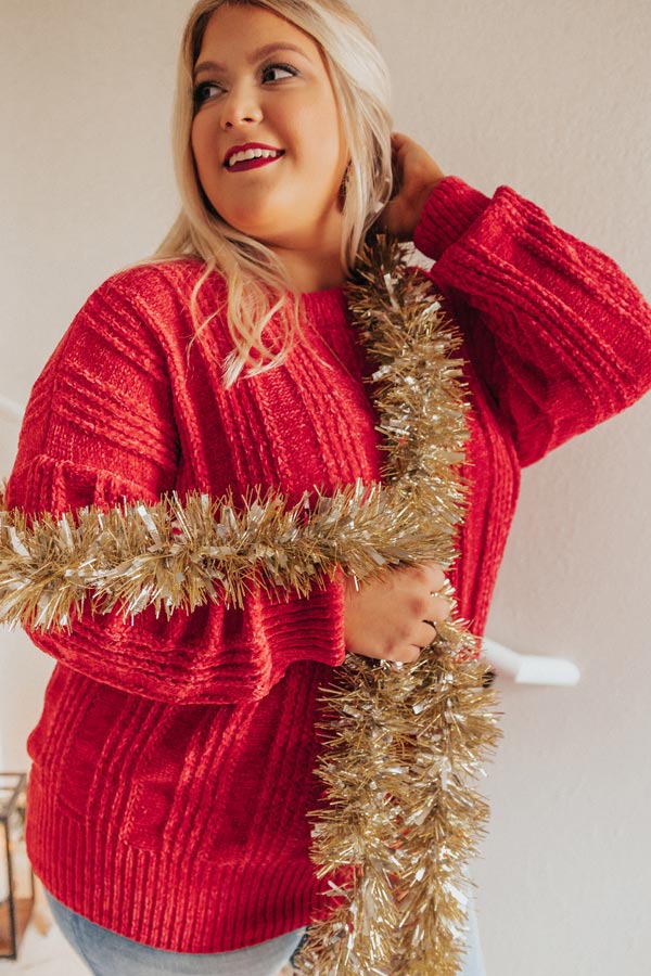 Plus Size - "Tis the season for "lattes and snuggles!" This raspberry colored sweater is the perfect cozy fall piece with its soft lightweight chenille material with wide cable knit texturing, a high rounded neckline, long loose sleeves with fitted cuffs, and relaxed silhouette that falls into a straight tunic length ribbed hemline! This piece can be styled with some distressed ankle skinnies, a black backpack, and leopard booties, or you can wear it front tucked into some charcoal flares with "The Seraphina Faux Leather Wedge in Grey" and our "All Caught Up Headband in Grey!" Measurements