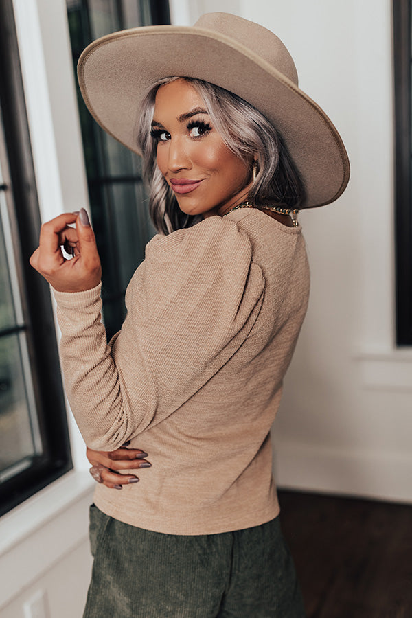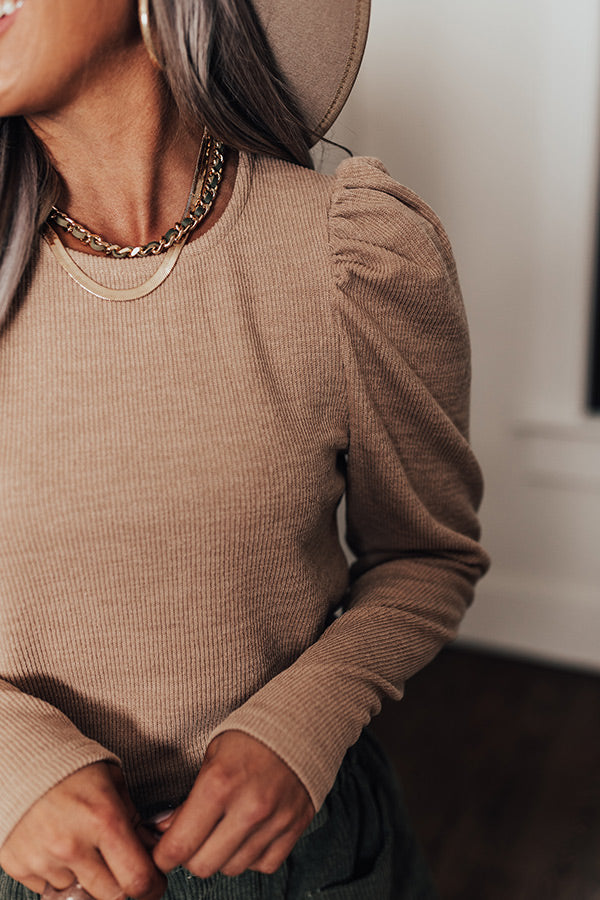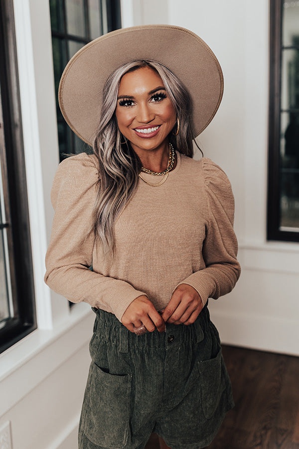 Perfect for tucking in, our chic iced latte hued 'Lattes Are My Love Language Top' featuring soft lightweight material, a rounded neckline, long loose sleeves with puff shoulders, and a flattering silhouette that ends in a straight hemline! Measurements