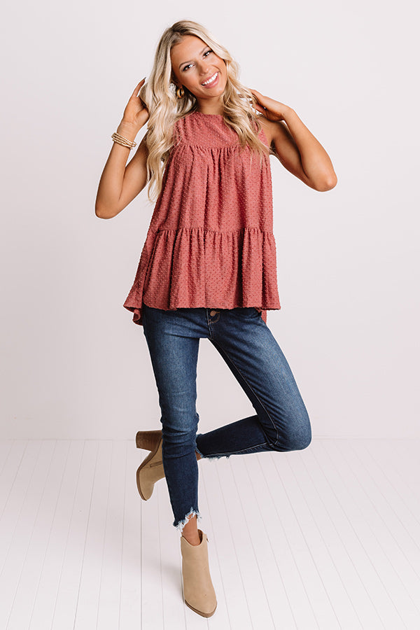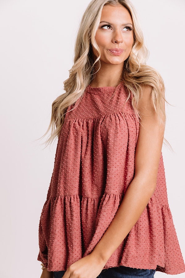 Arrive in style for "lattes with friends" in this adorable aurora red colored top featuring lightweight breezy material with polka dot texturing, a high rounded neckline, wide 3-inch sleeveless shoulder straps, and a relaxed tiered babydoll silhouette that falls into an uneven hemline! Measurements
