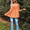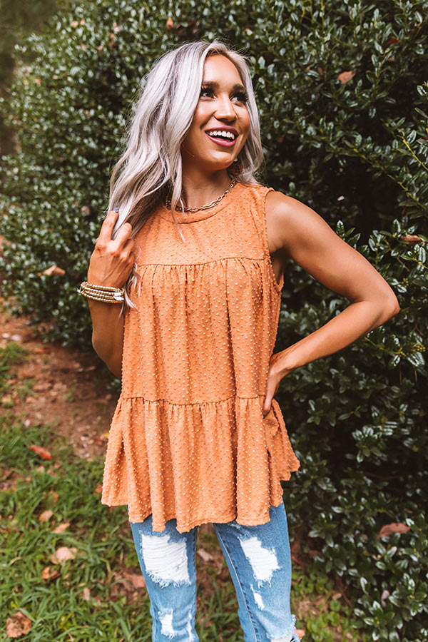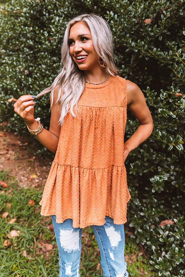 Arrive in style for "lattes with friends" in this adorable pumpkin colored top featuring lightweight breezy material with polka dot texturing, a high rounded neckline, wide 3-inch sleeveless shoulder straps, and a relaxed tiered babydoll silhouette that falls into an uneven hemline! Measurements