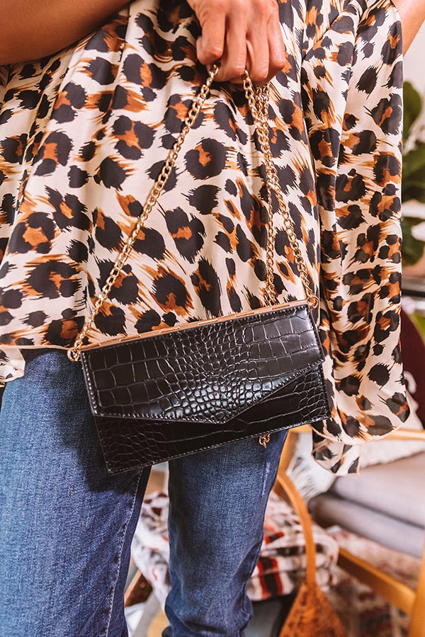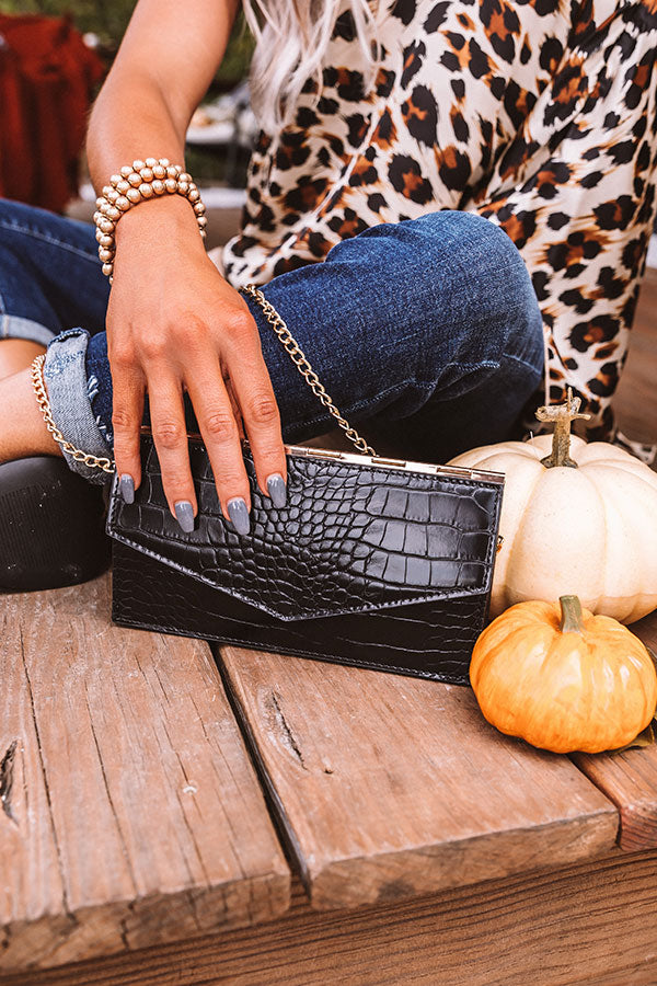 You are sure to live a lavish life when you accessorize with this stunning black clutch featuring sleek faux leather material with snake print texturing, a chain shoulder strap, and a lightweight rectangular silhouette with a flap closure!