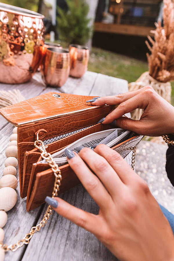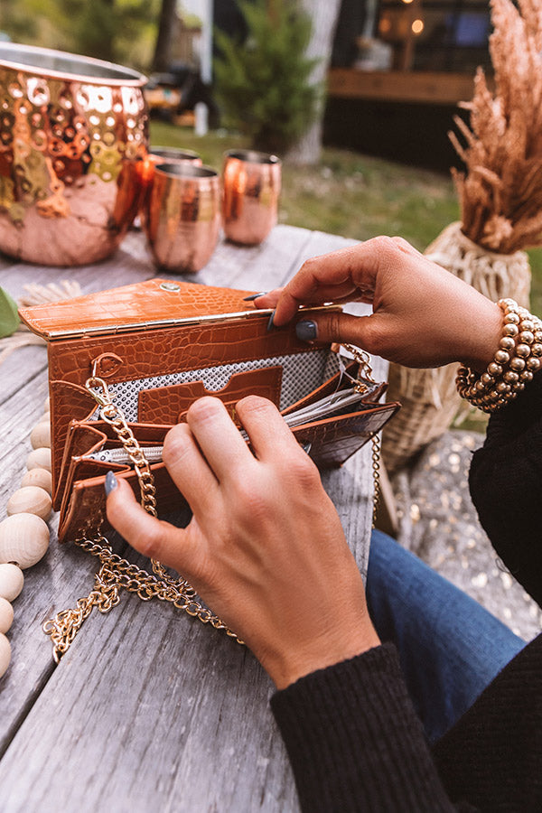 You are sure to live a lavish life when you accessorize with this stunning maple colored clutch featuring sleek faux leather material with snake print texturing, a chain shoulder strap, and a lightweight rectangular silhouette with a flap closure!