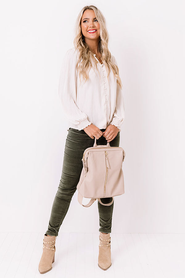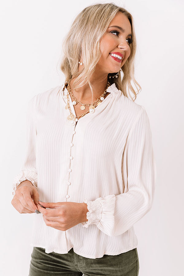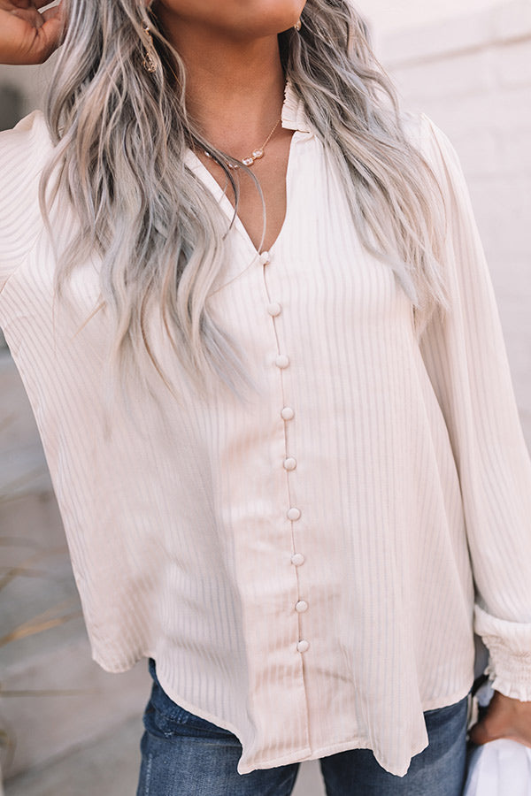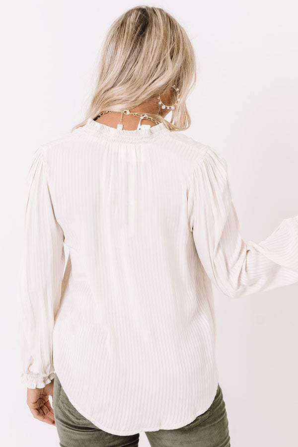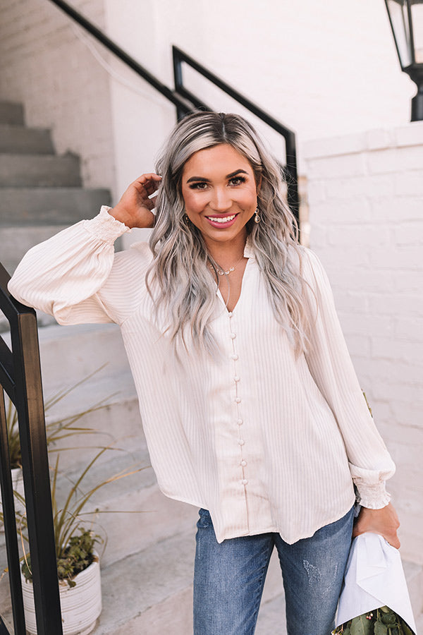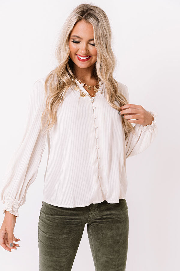 Showcase your lavish life and style with this charming ivory hued shift top featuring lightweight flowy material, a button down front, a v-cut neckline with a short smocked collar, subtle vertical accent stripes, long loose sleeves with smocked cuffs, and a relaxed silhouette that falls into a straight hemline! Measurements