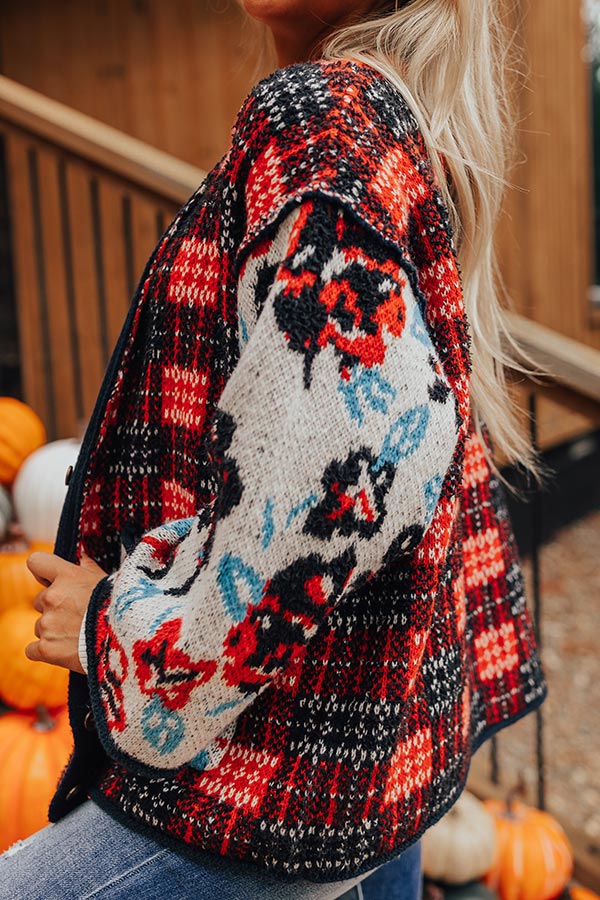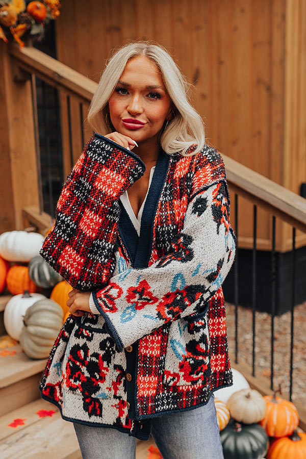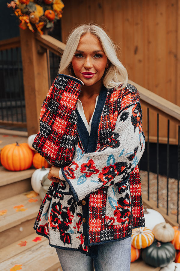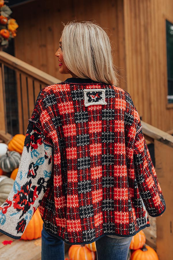 - Unlined, knit material with panels of abstract floral and plaid patterns featuring black, orange, and blue hues
