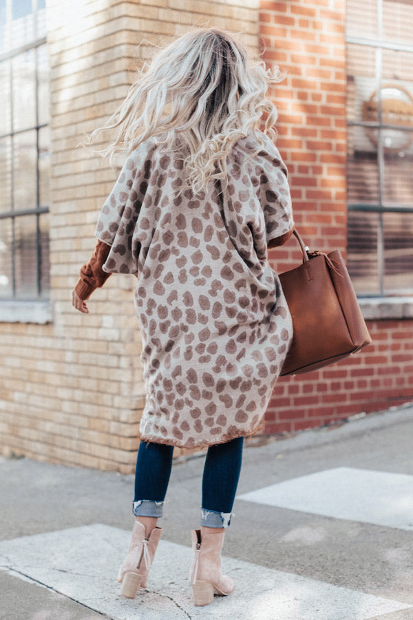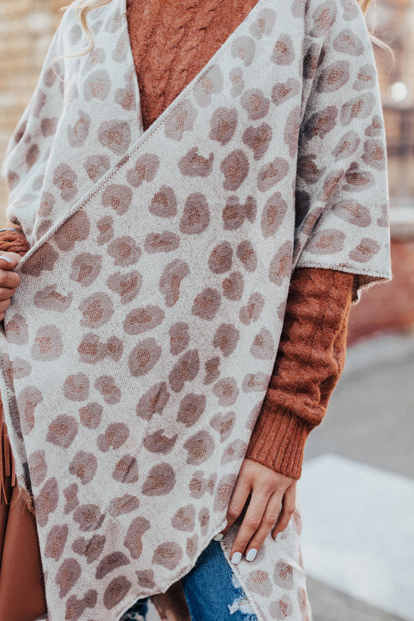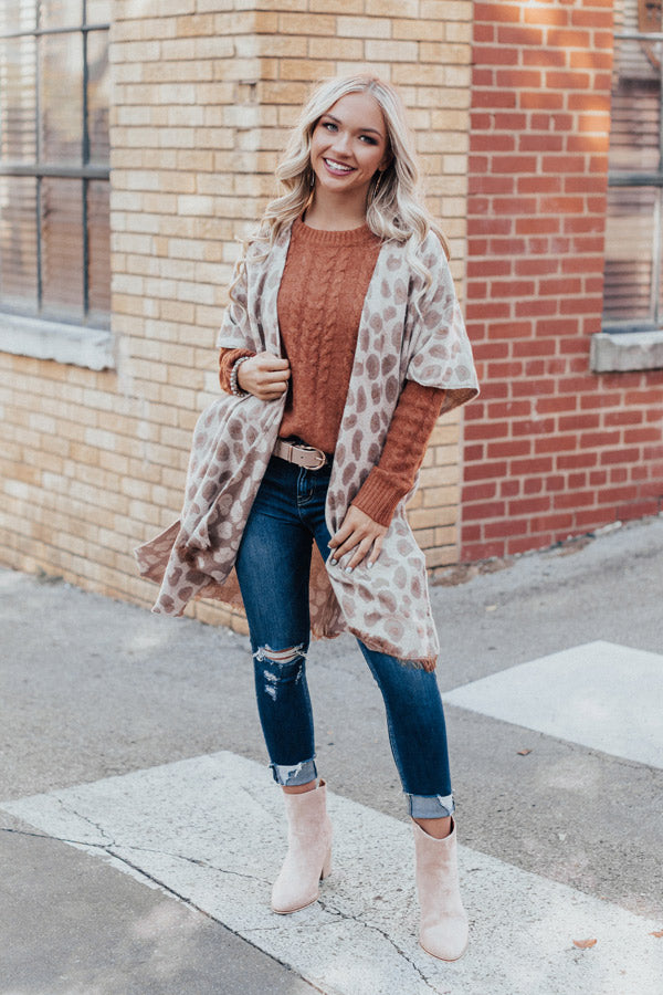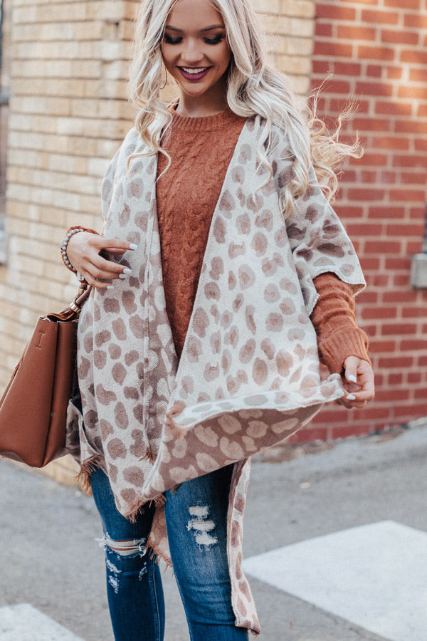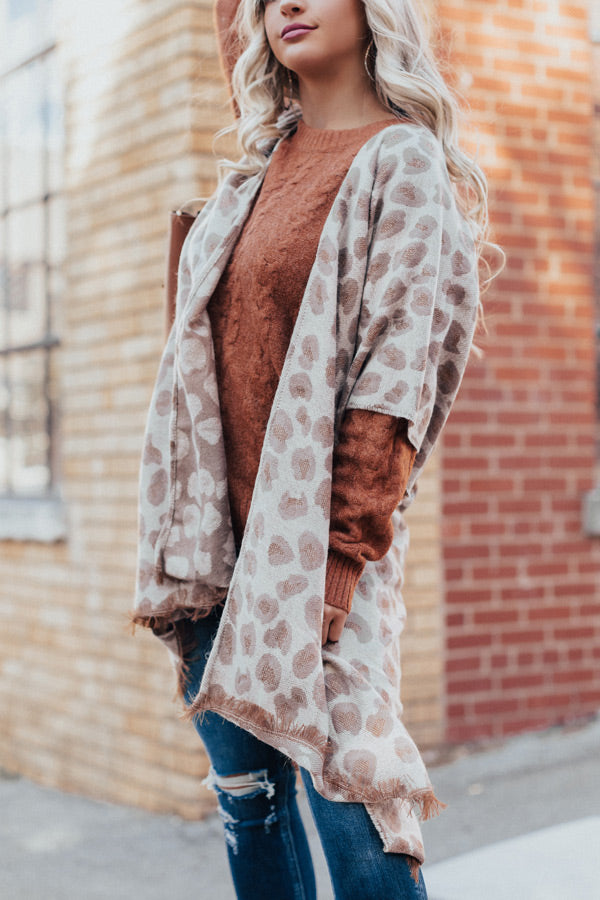 Layer up in style with this lovely iced latte colored poncho featuring soft lightweight tight knit material patterned with a neutral hued leopard print, fringed edge detailing, and an ultra draped silhouette that falls into an uneven mid-thigh length hemline! You can style this versatile piece with just about anything from a basic tank to a sweater, jeans to skirts or dresses, booties to wedges or sandals, clutches to totes, and hats to earrings! Measurements
