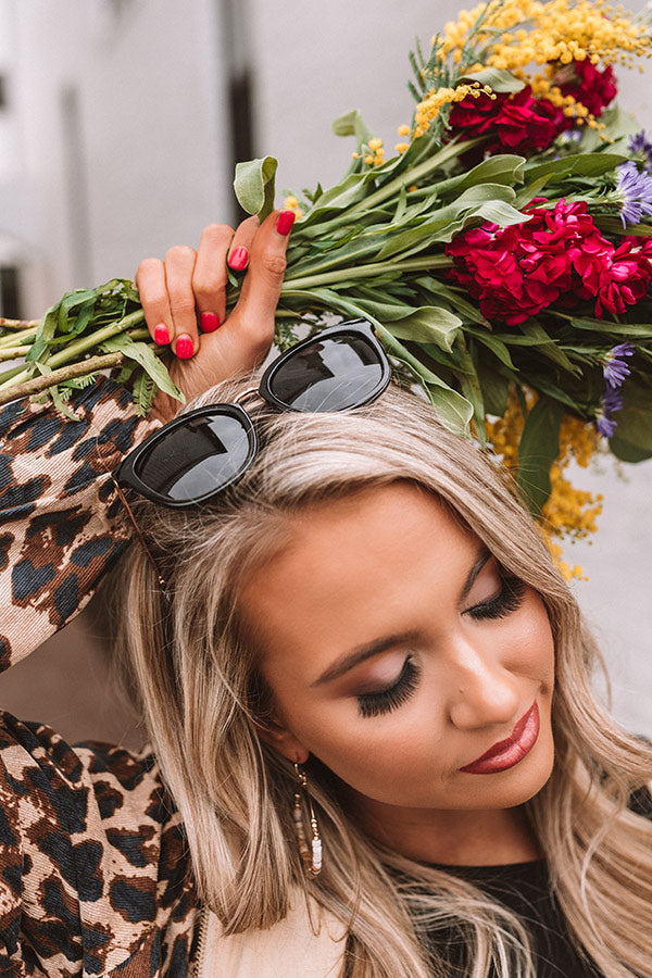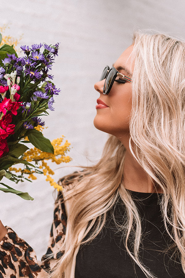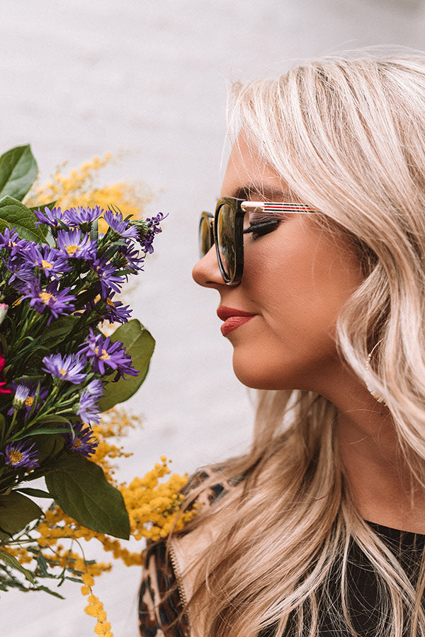 "Lead the way" in these adorable statement sunnies featuring rounded black frames, a gold nose bridge, dark tinted lenses, and red and green accent stripes on the ear pieces!