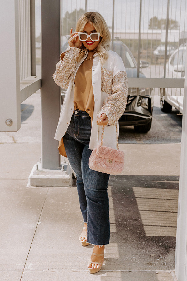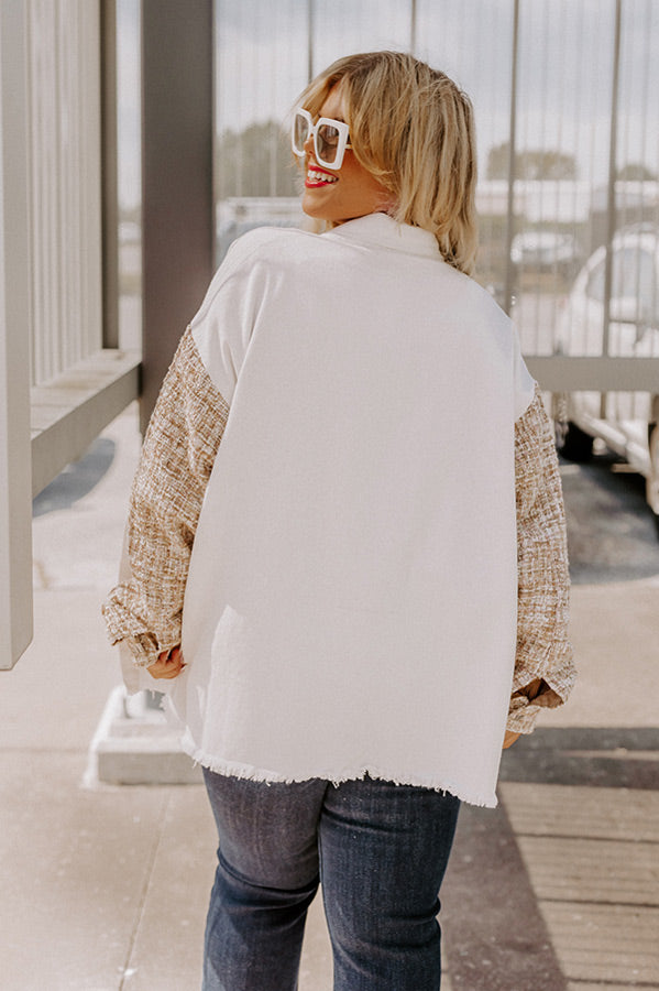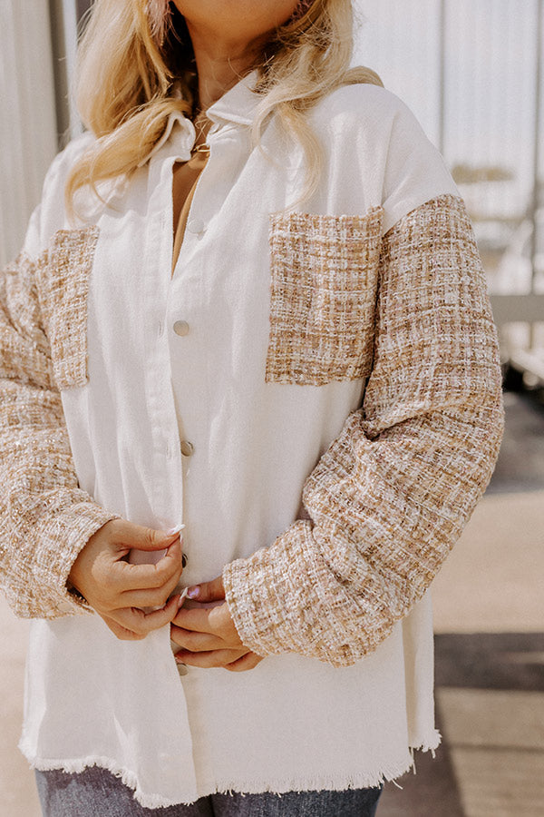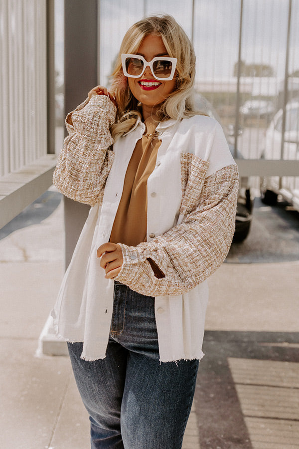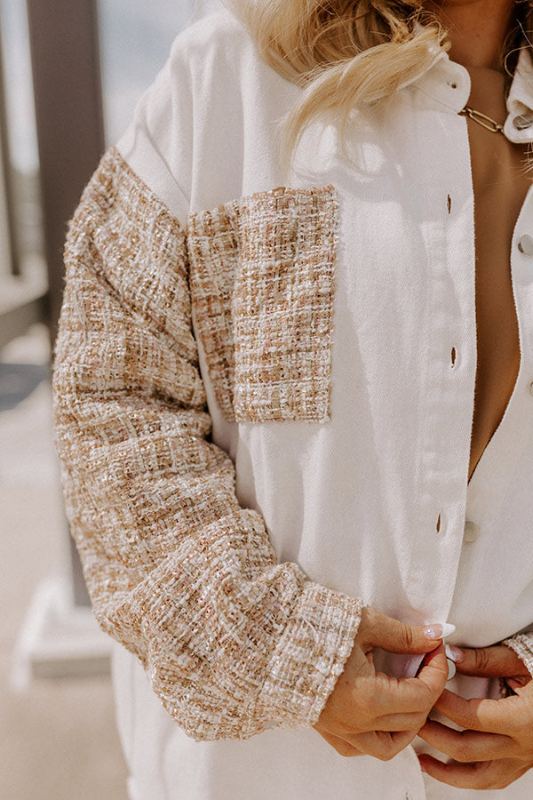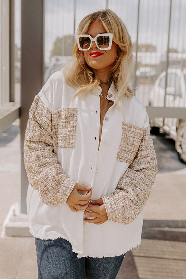 Layer up in the trendiest of ways with our 'Leaf Lined Drive' jacket. Features a lightweight mixture of denim and tweed material, button-down collared neckline, two accent chest pockets, long sleeves with button closure cuffs, and a flattering silhouette with frayed hemline.