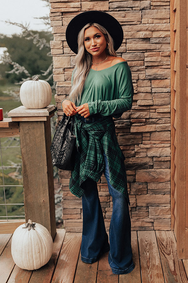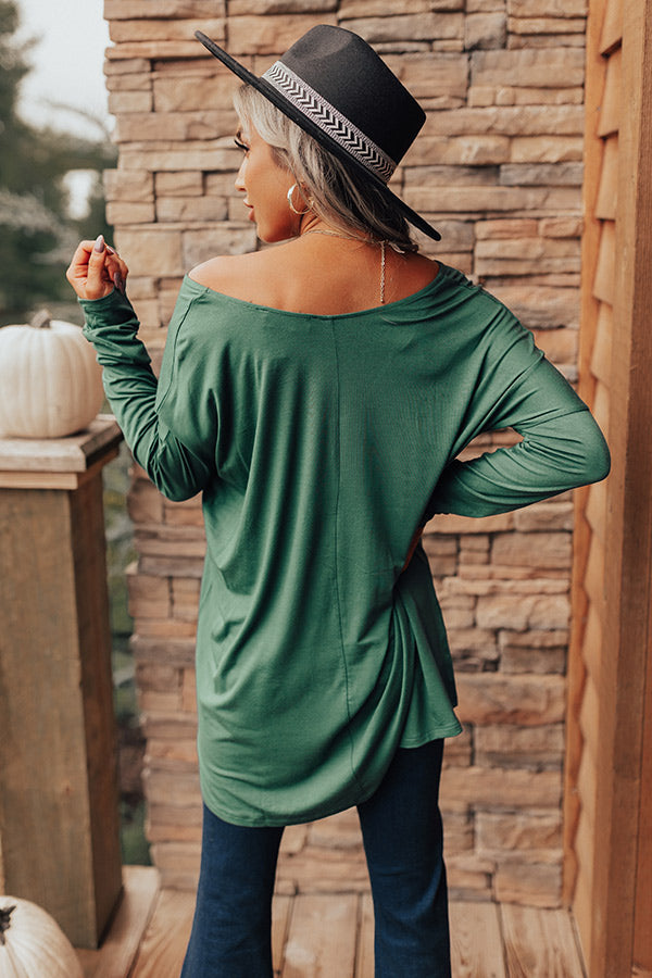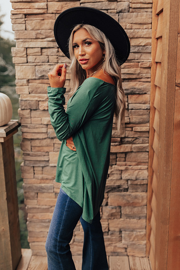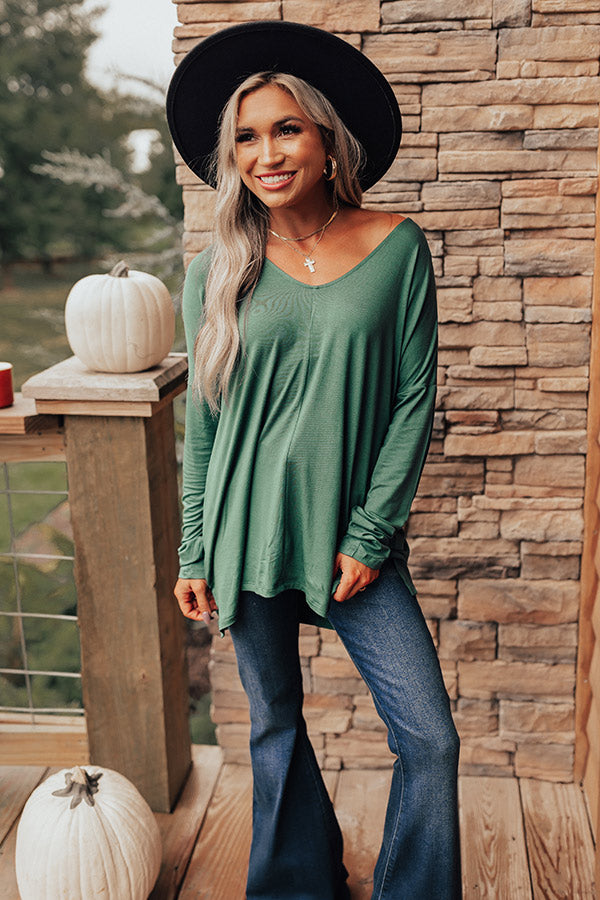 The perfect fall basic, our simple but stylish hunter green 'Lean Into Me Shift Top' features lightweight material, a scooped v-cut neckline, long loose sleeves, and a relaxed silhouette that falls into a straight hemline!