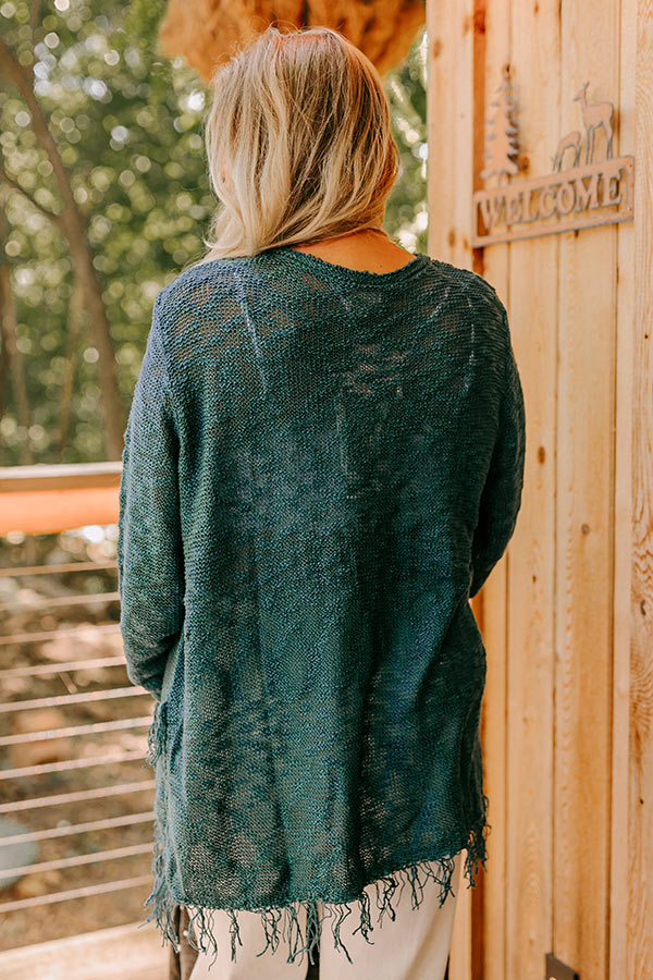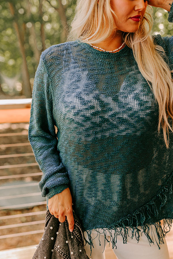 Plus Size - People are sure to lean on you for style advice when you wear this adorable dark teal hued sweater featuring lightweight semi-sheer knit material, a high rounded neckline, long loose sleeves, and a relaxed silhouette that falls into a wrapped crisscrossed hemline with ultra fringe trim detailing!