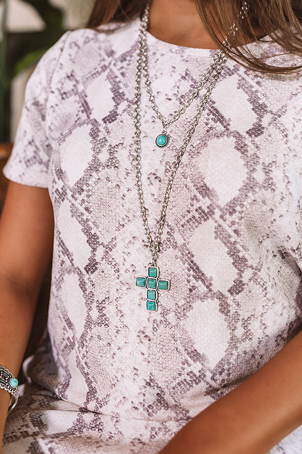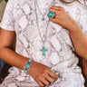 Make a statement with our stunning "Leap Of Faith" necklace featuring two layered silver chains with a circle turquoise charm and a turquoise stone cross pendant!