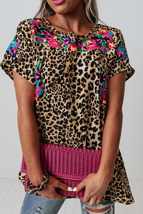 You won't have to learn to love this fierce and flirty top because we have no doubt you will love it at first sight! It features lightweight material patterned with a black and brown leopard print and colorful embroidered floral detailing, a scooped neckline, short sleeves, and a relaxed silhouette that falls into a straight hemline! Measurements