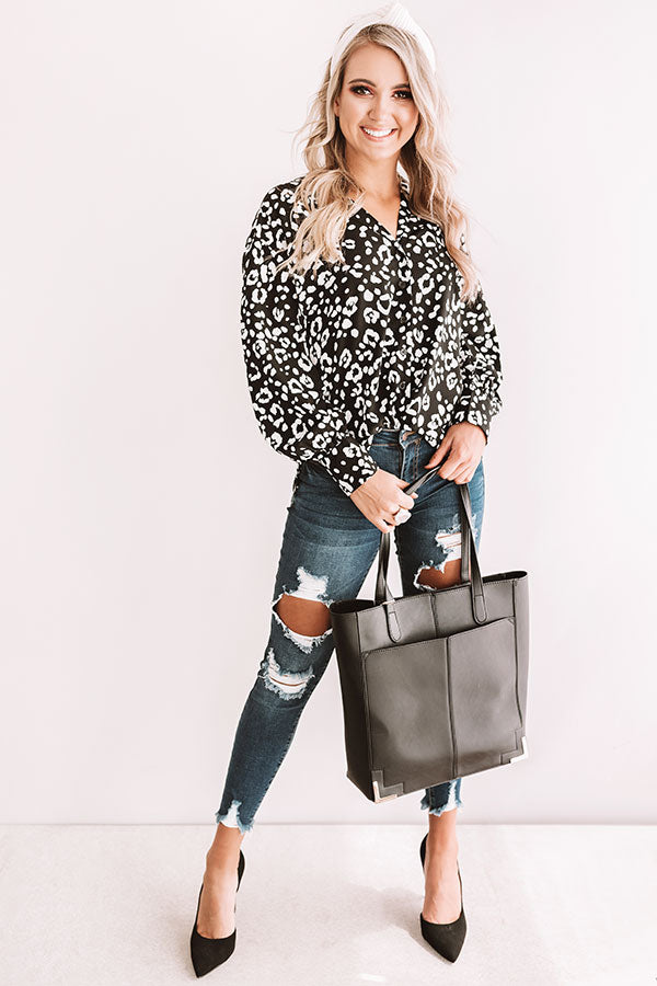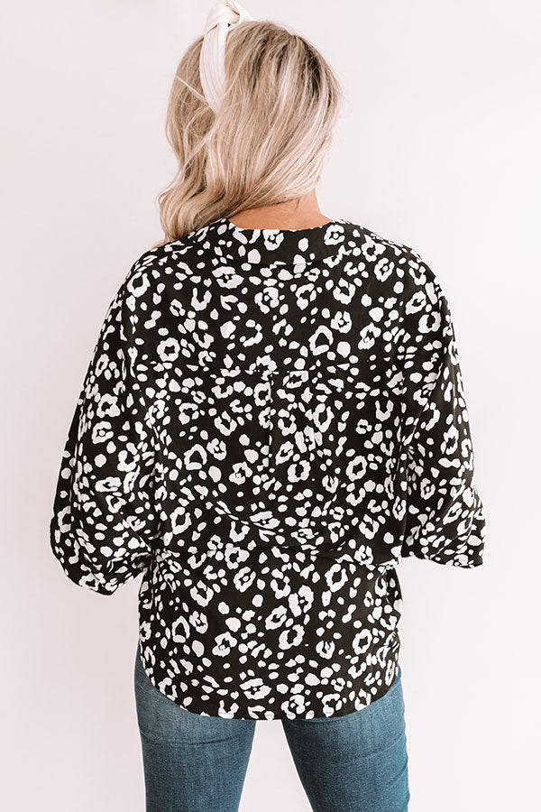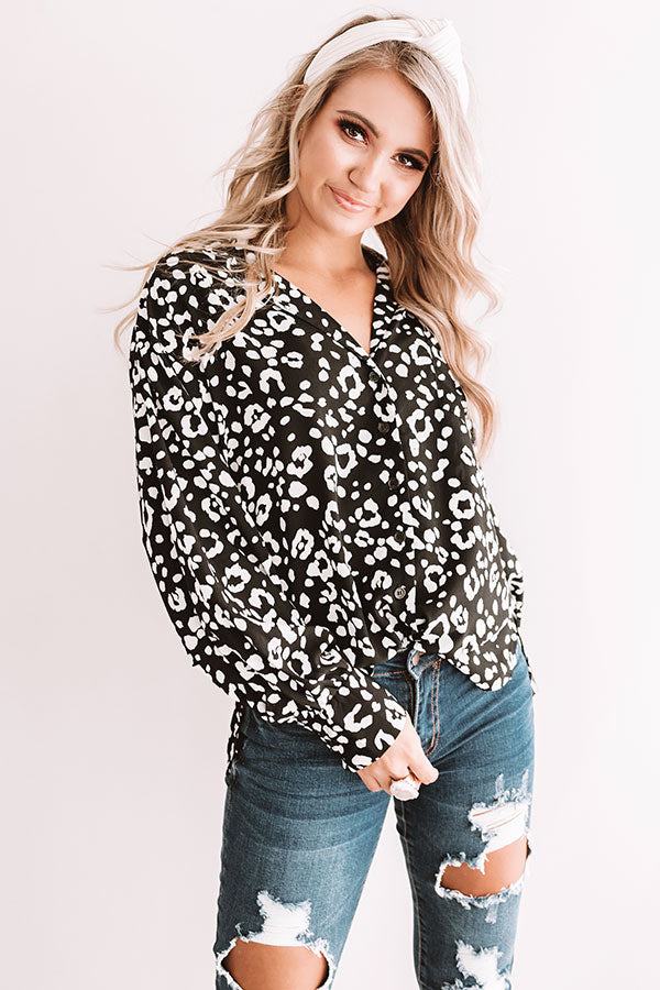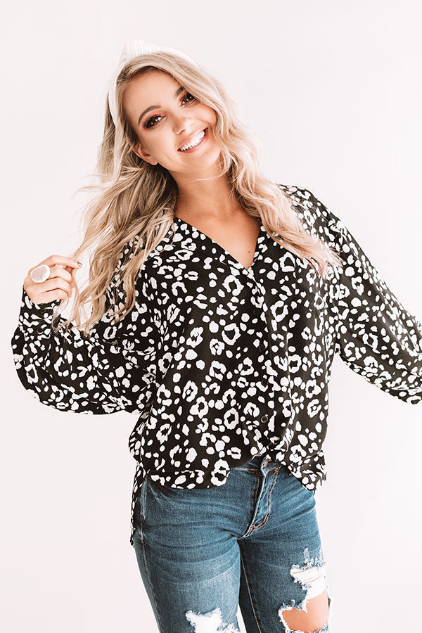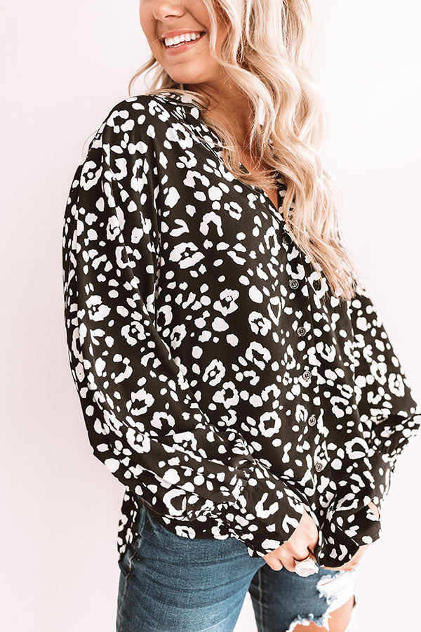 Let your transitional style run wild with this fashionable mocha top featuring a bold black cheetah print, lightweight breezy material, long bishop sleeves with button closure cuffs, and a relaxed button up bodice that falls into a rounded split sided hemline that looks gorgeous front tucked! This flirty piece looks amazing styled with some distressed skinnies, an ivory headband, and a black pump and tote, or it can be tucked into a black skirt with red accents like "The Hadid Faux Suede Bootie" and our "Chasing Bliss Earrings!" Measurements