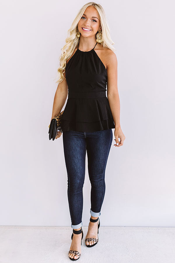 This black beauty features a keyhole cutout in the front, a ruffled peplum bottom, and a zip up back with tie closure! The open back looks fantastic styled with our "Adler Midrise Relaxed Ankle Skinny," black wedges, and hoop earrings for a unique summer look that will have you looking beautiful while leavin' on a private jet! Measurements