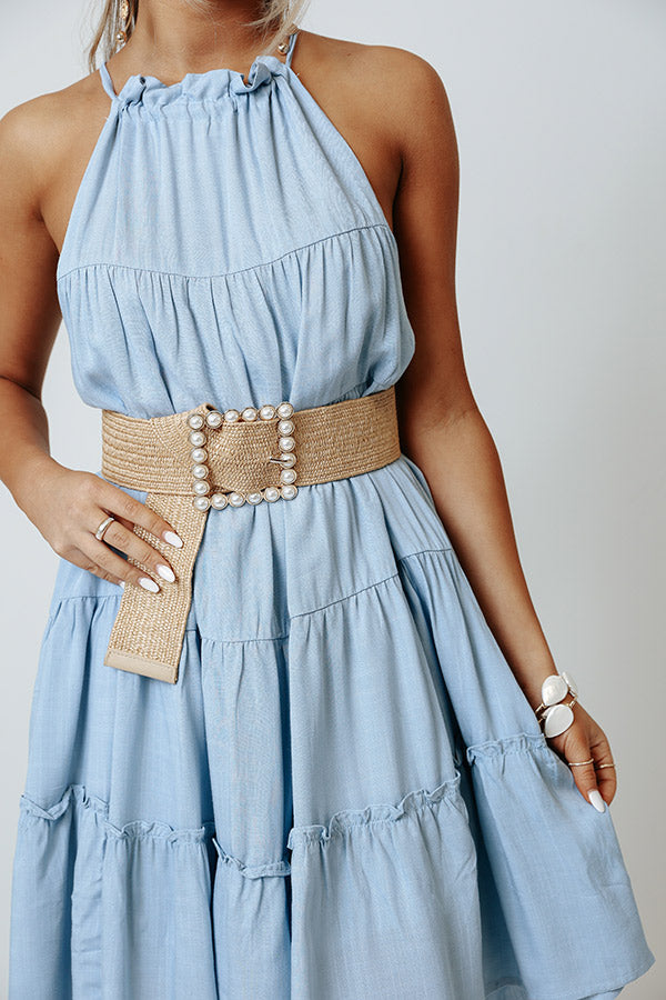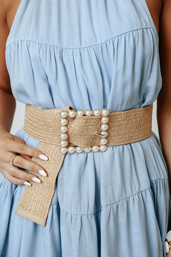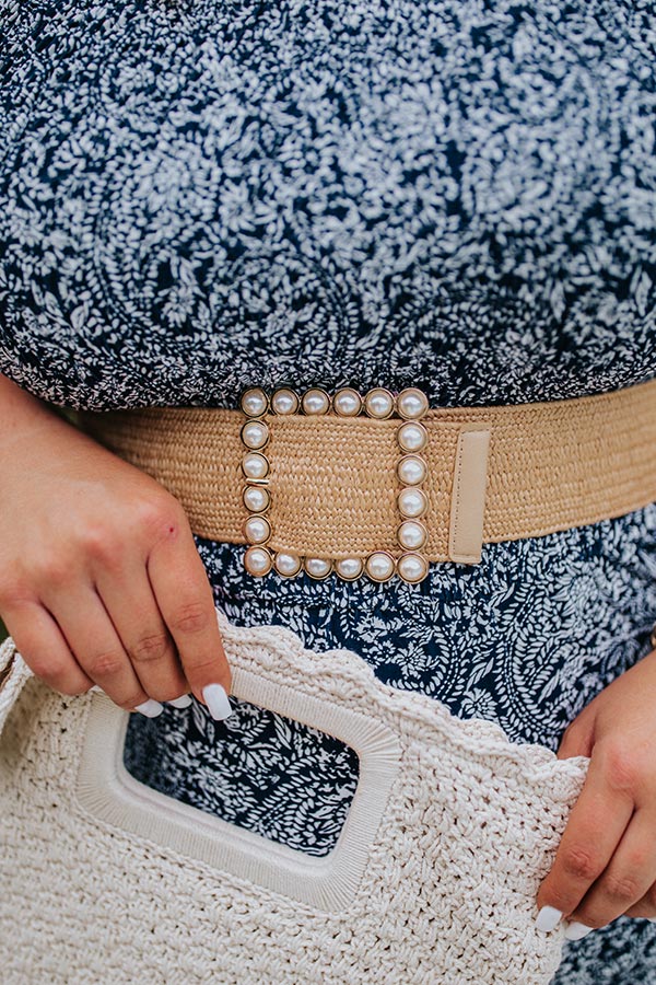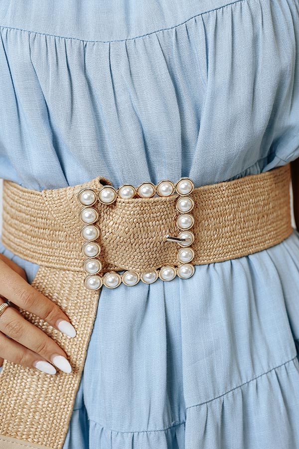 You are sure to leave a stylish legacy when you complete your look with this gorgeous belt featuring a wide tan woven strap with an oversized pearl square buckle!