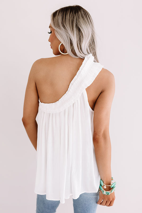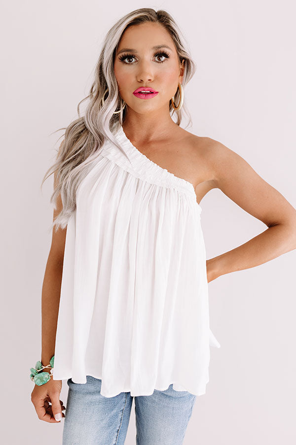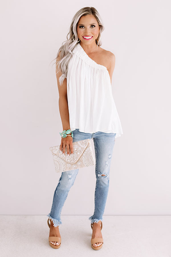 You are guaranteed to have a flirty summer in our darling white "Leis And Kisses" top featuring lightweight breezy material with pleated detailing, a wide single shoulder strap with a ruffled diagonal neckline, and an ultra relaxed silhouette that falls into an uneven hemline! You can style this unique piece a variety of ways, like with some distressed ankle skinnies, neutral heels, and an embellished clutch, but you can also wear it with some frayed black shorts, "The Allen Wedge in Snake Print," and a matching snake print hair scarf! Measurements