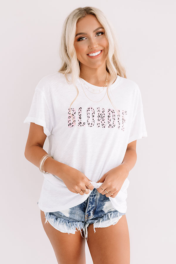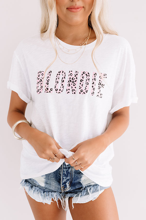 Make a fashion statement in this trendy white tee featuring soft lightweight material, a scooped neckline, large pink BLONDIE lettering on the front patterned with a cute leopard print, short loose sleeves, and a relaxed silhouette that falls into a straight hemline! We have styled this casual cutie with some distressed denim shorts and matching sneakers, but you can also wear it with our "Tea And Cozy Ombre Joggers in Pink," sunnies, "The Chloe Leopard Sneaker," and "The Essential Faux Leather Backpack in Black!" Measurements