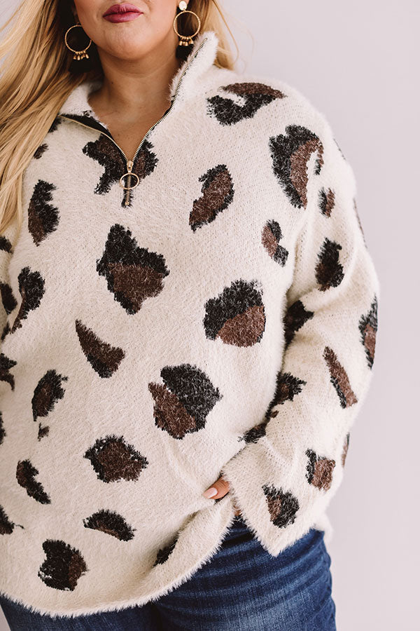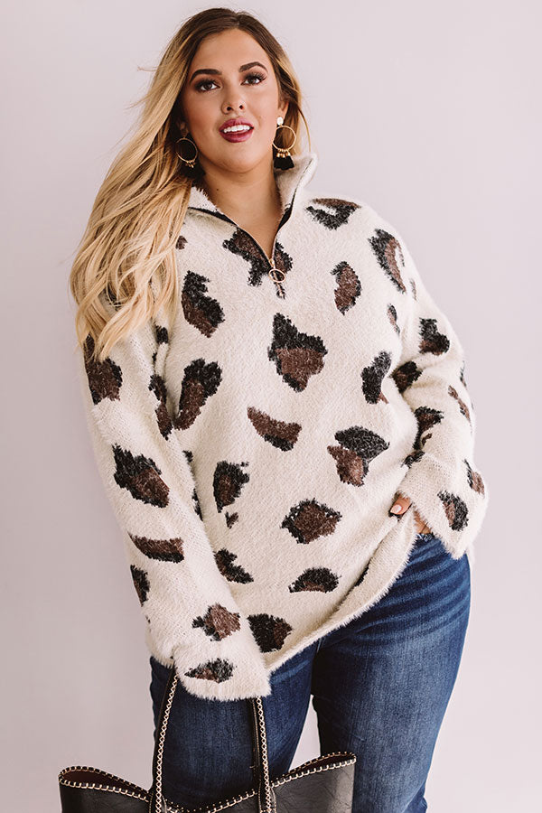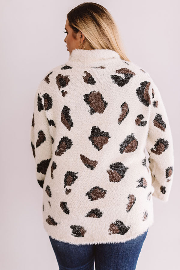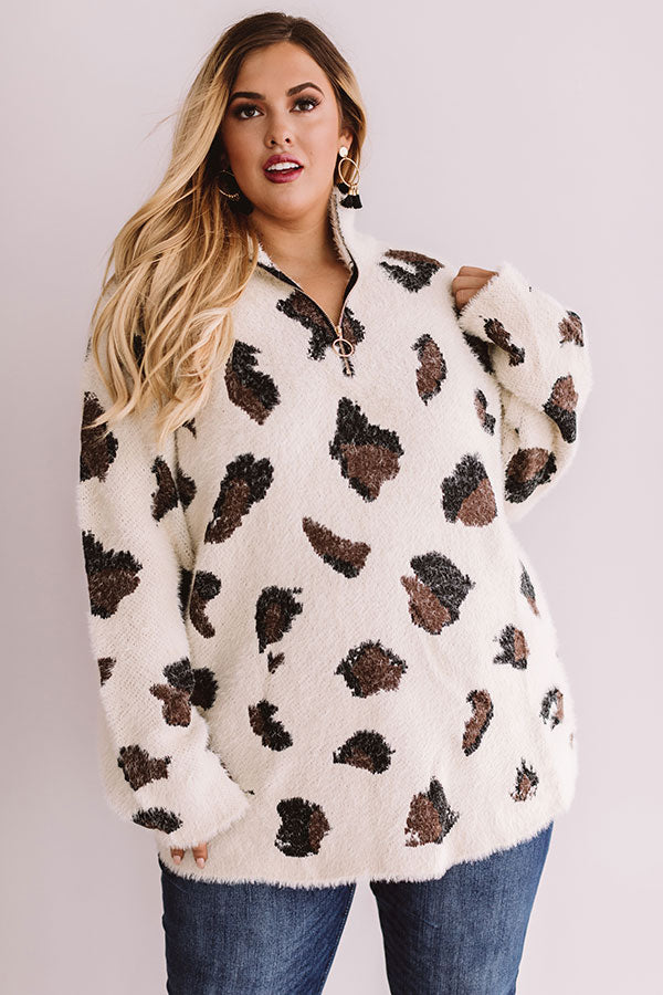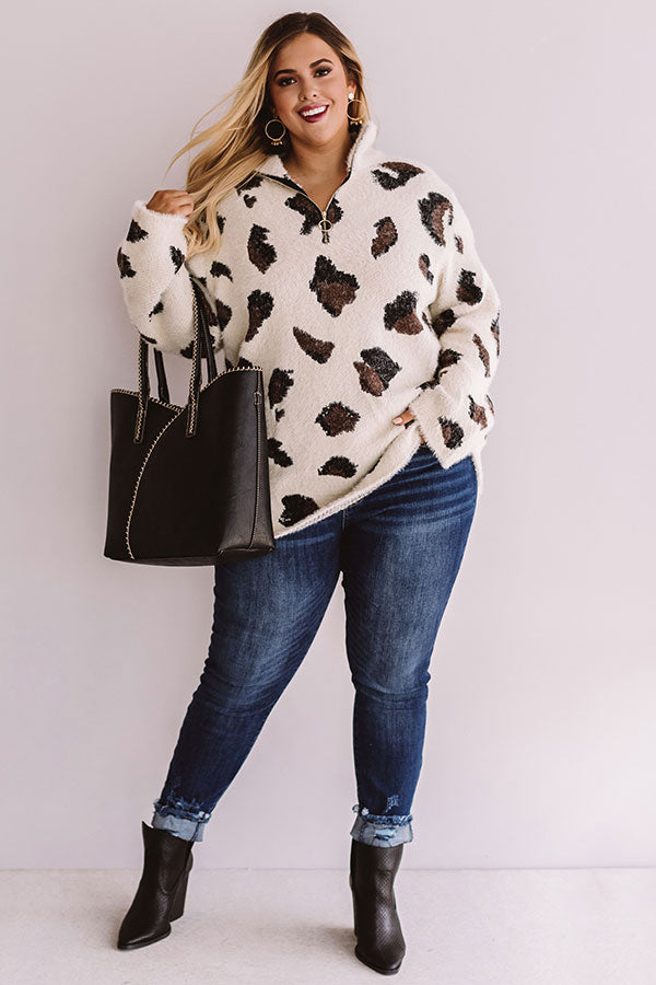 Plus Size - You will want to wear this sweater forever when you feel its ultra soft material and see its large leopard print, v-zip neck with a high collar, long sleeves, a loose fit, and a rounded hemline! We have styled this thick warm piece with some dark cuffed jeans and a black bootie and tote, but you can also pair it with our "You Glow Girl Midrise Pocket Legging in Black" and "The Skye Sneaker in Black" for the ultimate winter look! Measurements