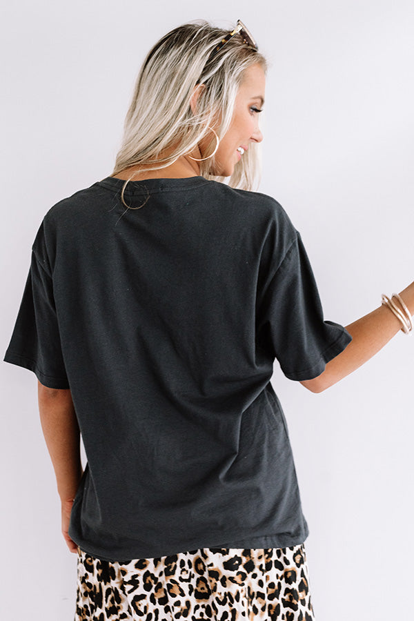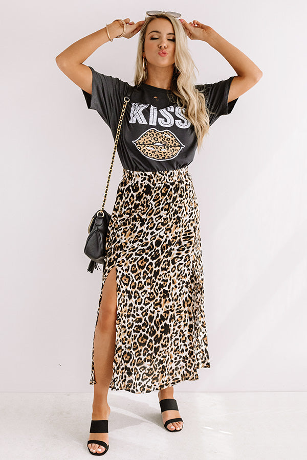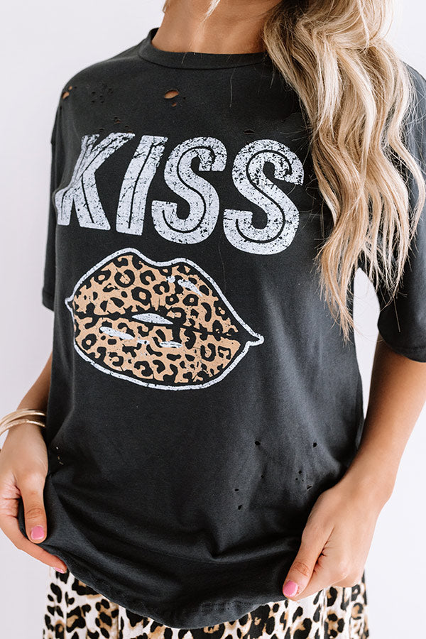 Stay fierce and flirty this summer with our black "Leopard Kiss" tee featuring soft lightweight material with distressed detailing, a high rounded neckline, short loose sleeves, an adorable leopard print pair of lips and font graphic on the front, and a relaxed silhouette that falls into a straight hemline! We have styled this grunge cutie with a matching leopard skirt, sunnies, and a black jute wedge and crossbody, but you can also wear it with some distressed denim shorts, "The Lyla Sandal in Hot Pink," and our hot pink "Jetsetter Chic Hair Scarf!" Measurements