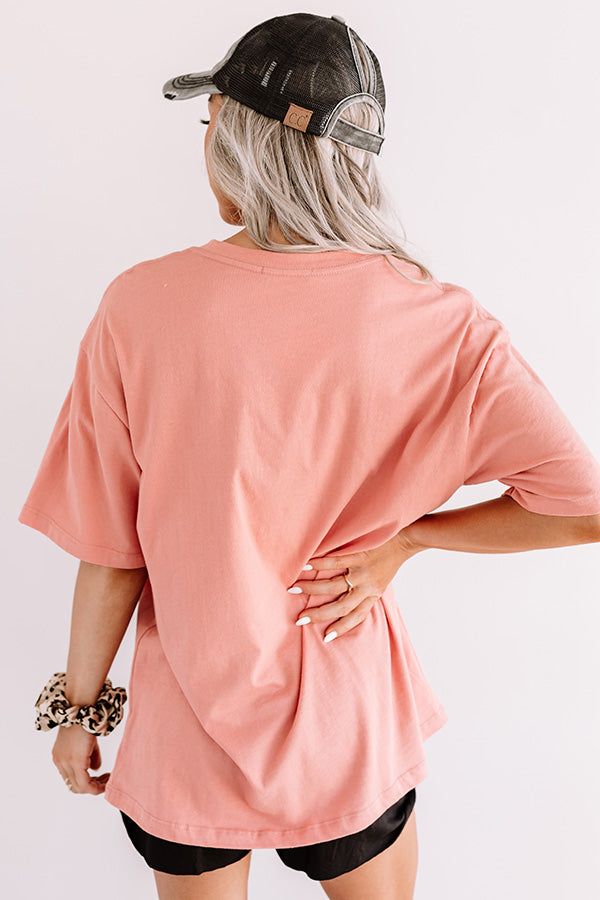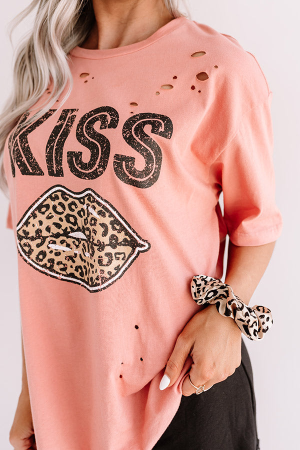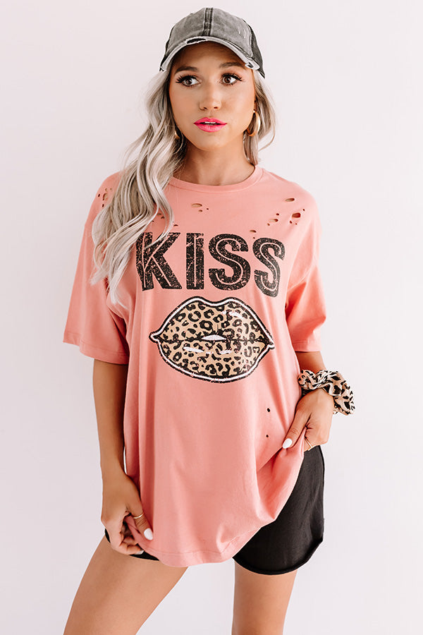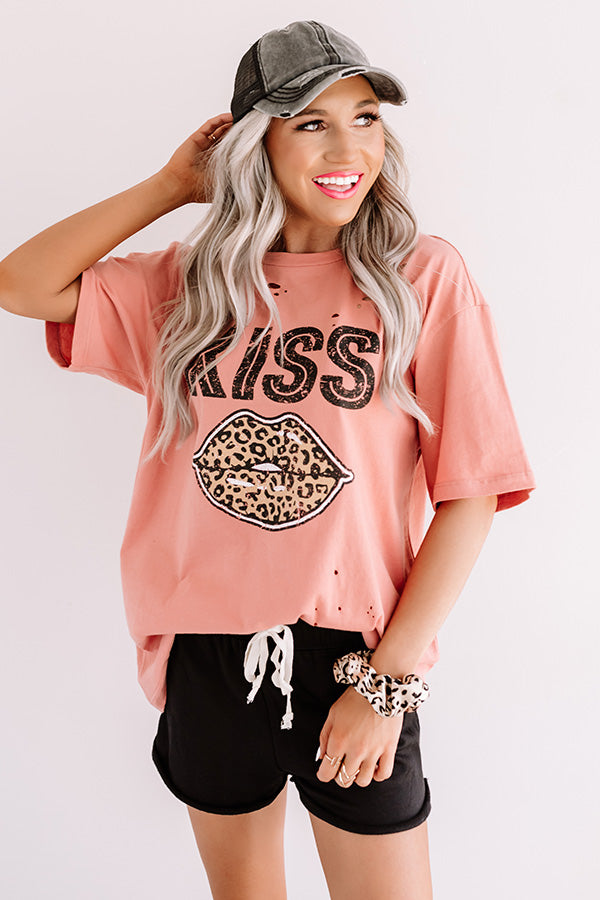 Stay fierce and flirty this summer with our dark peach colored "Leopard Kiss" tee featuring soft lightweight material with distressed detailing, a high rounded neckline, short loose sleeves, an adorable leopard print pair of lips and font graphic on the front, and a relaxed silhouette that falls into a straight hemline! We have styled this grunge cutie with some black shorts, a matching baseball cap, and some trendy sneakers, but you can also wear it with some distressed ankle skinnies, "The Allen Wedge in Black," and our "New Crush Canvas Leopard Tote in Brown!" Measurements