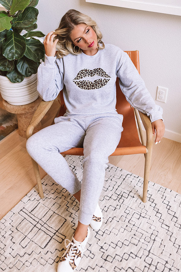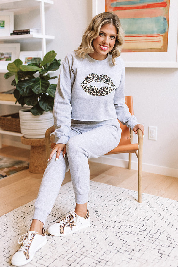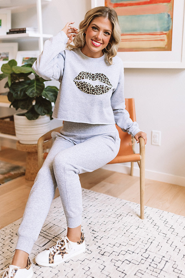 Leopard Lips Crop Sweatshirt in Grey