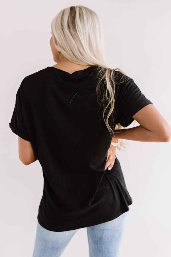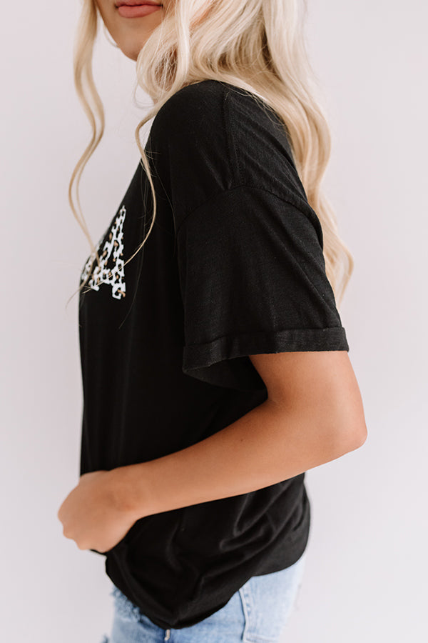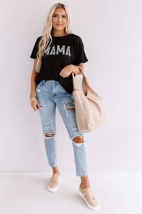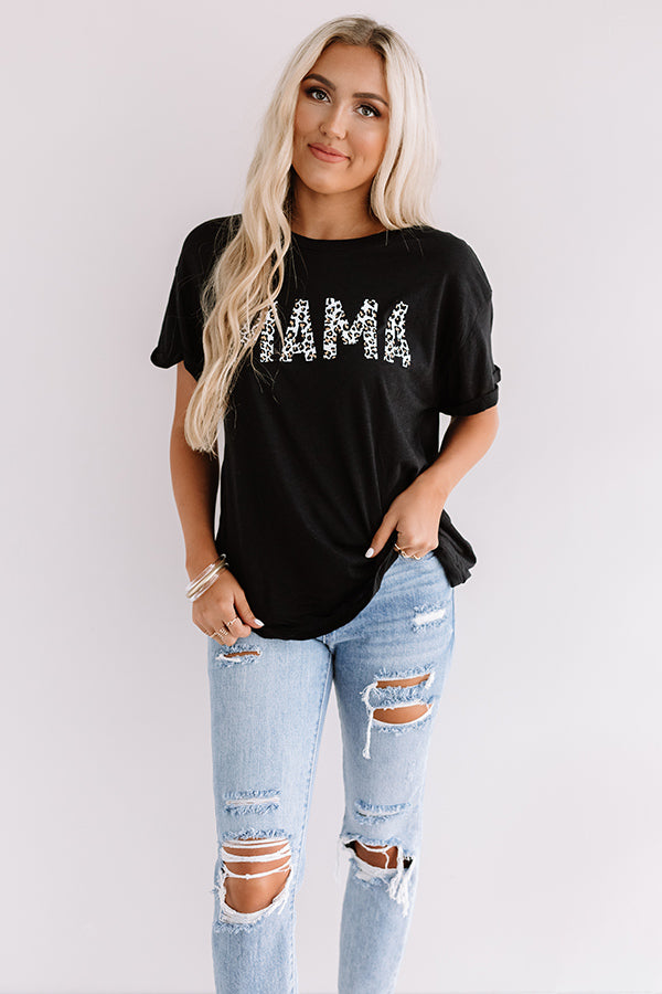 Show off your super mama powers with this adorable black tee featuring soft lightweight material with bold leopard print block lettering on the front, a high rounded neckline, short loose sleeves, and a relaxed silhouette that falls into a straight hemline that can be knotted! You can style this casual cutie a variety of ways, like with some distressed light wash skinnies and a neutral sneaker and faux leather tote, but you can also wear it with some frayed white shorts, "The Kelsie Leopard Espadrille Wedge," and our "Sunshine Suite Sunnies in Black!" Measurements
