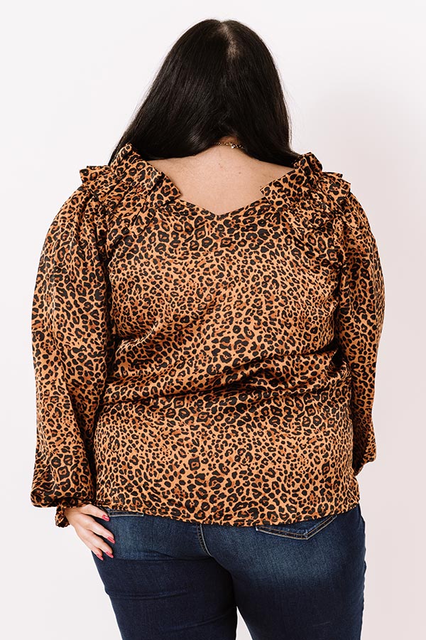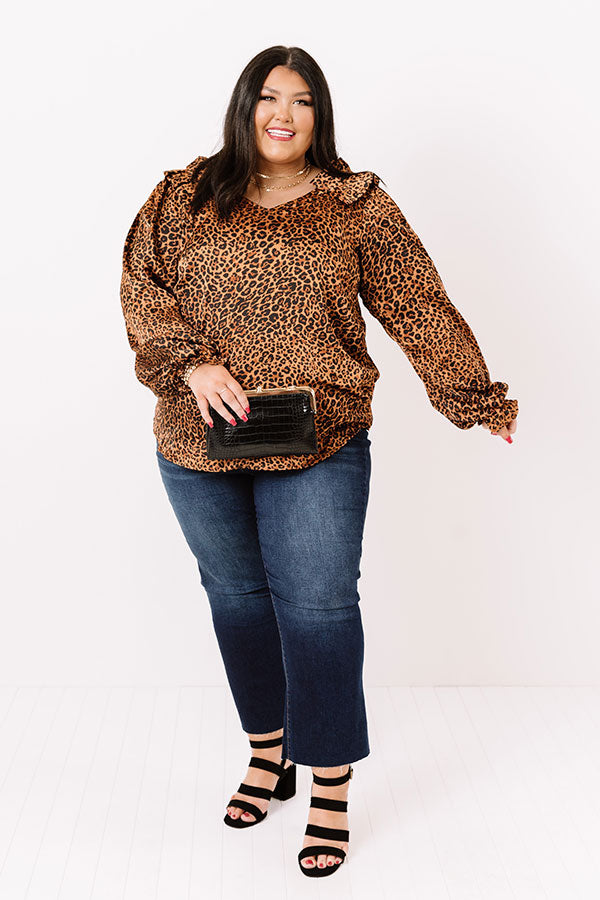 Plus Size - We have no doubt you will want this gorgeous camel colored shift top on your wishlist with its sleek lightweight satin-like material patterned with a black leopard print, oversized bubble sleeves with fitted cuffs and ruffled accent shoulders, a wide v-cut neckline and upper back, and a relaxed silhouette that ends in a straight hemline!