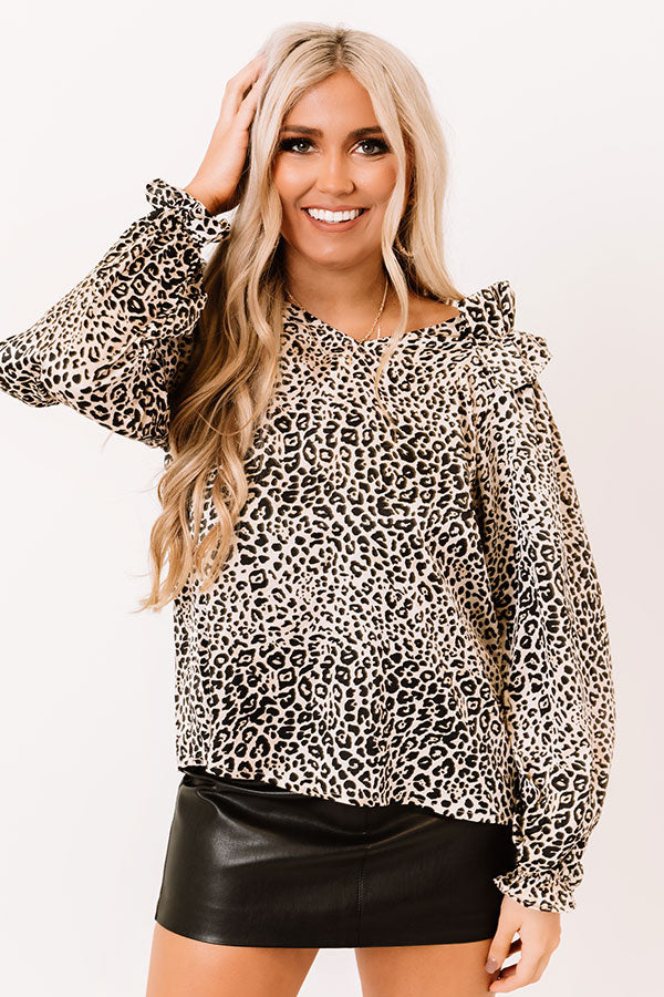 We have no doubt you will want this gorgeous stone colored shift top on your wishlist with its sleek lightweight satin-like material patterned with a black leopard print, oversized bubble sleeves with fitted cuffs and ruffled accent shoulders, a wide v-cut neckline and upper back, and a relaxed silhouette that ends in a straight hemline!