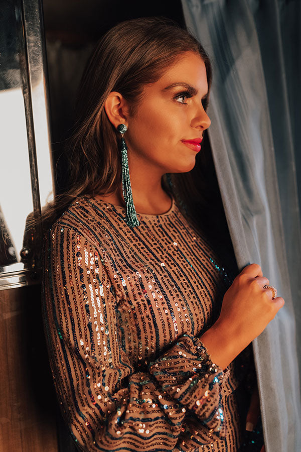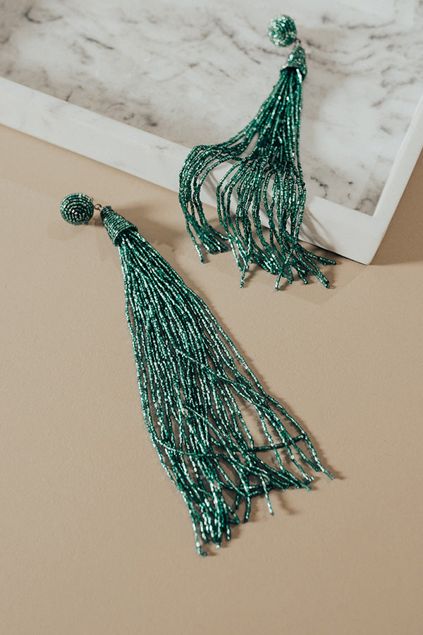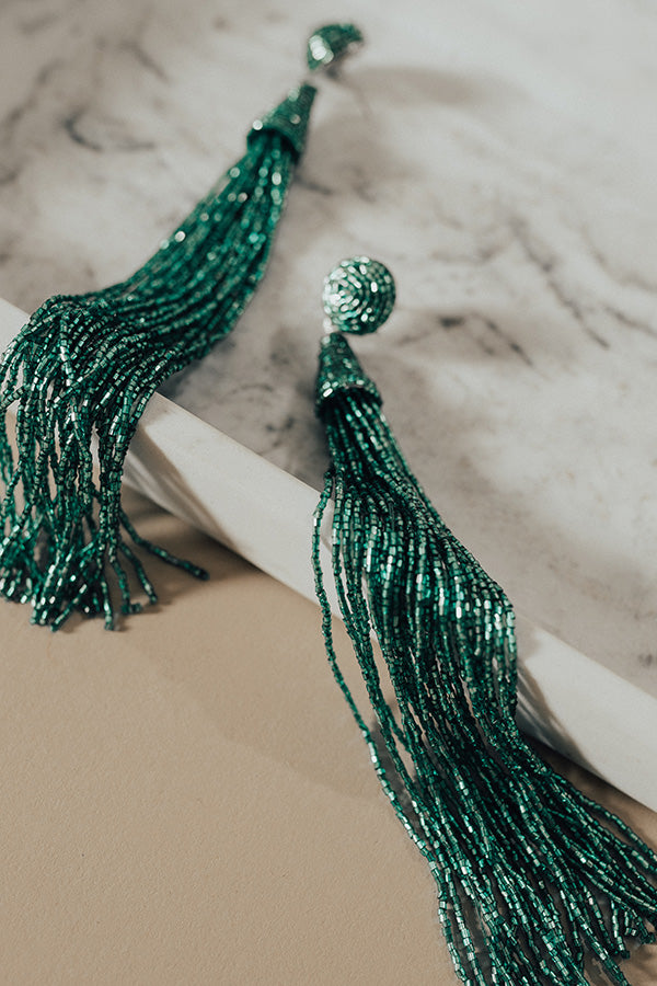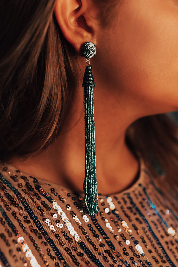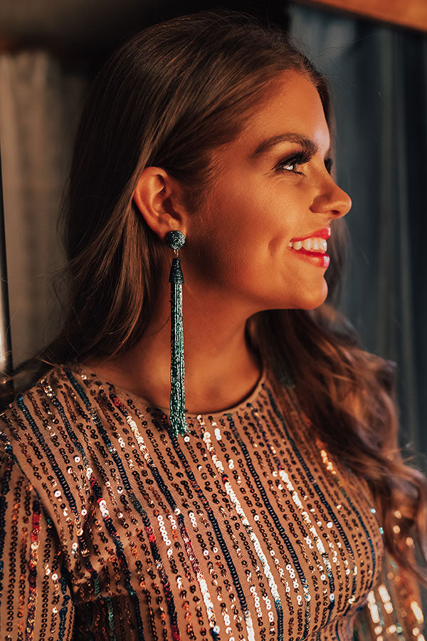 Stay focused and sparkly in our teal colored "Let The Bead Drop" statement earrings featuring circle half ball studs and long shoulder-length beaded tassels!