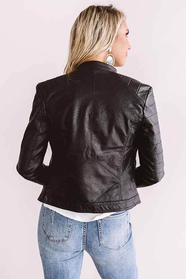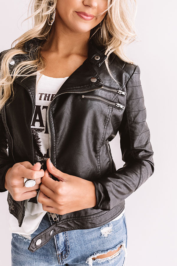 This edgy black jacket will have you saying "let the good times roll" with its sleek faux leather material, long sleeves with wide ribbed detailing, a short collar, two accent chest zippers, a straight hemline, side pockets, and a flap front silhouette with an a symmetrical zip and button closure! You can style this versatile piece with just about anything from a basic tank to a sweater, jeans to dresses, wedges to sandals, clutches to totes, and hats to earrings! Measurements
