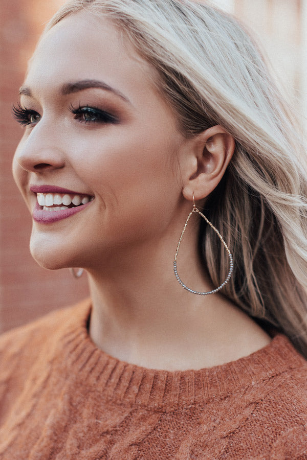 Leave a little glitz wherever your go with these dainty earrings featuring thin gold teardrop hoops with dark grey beads!