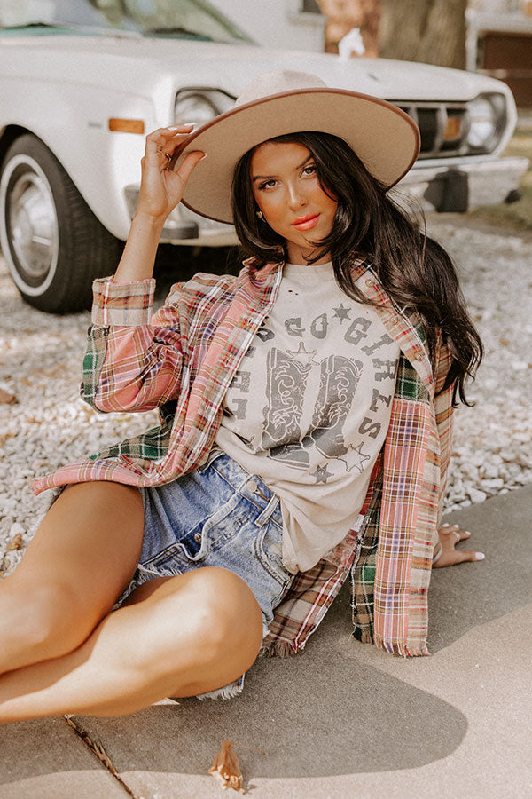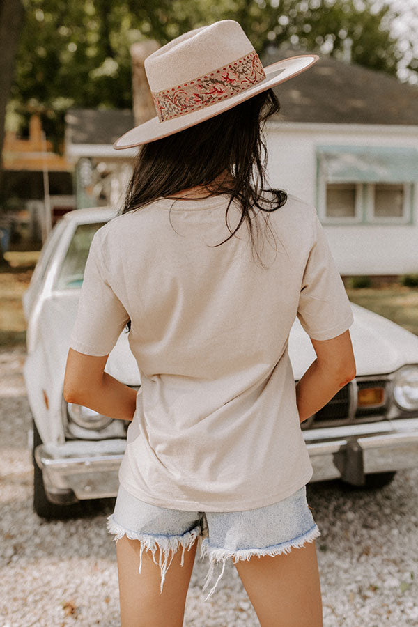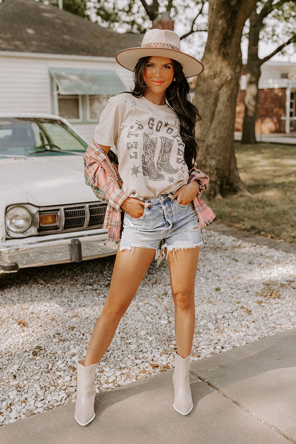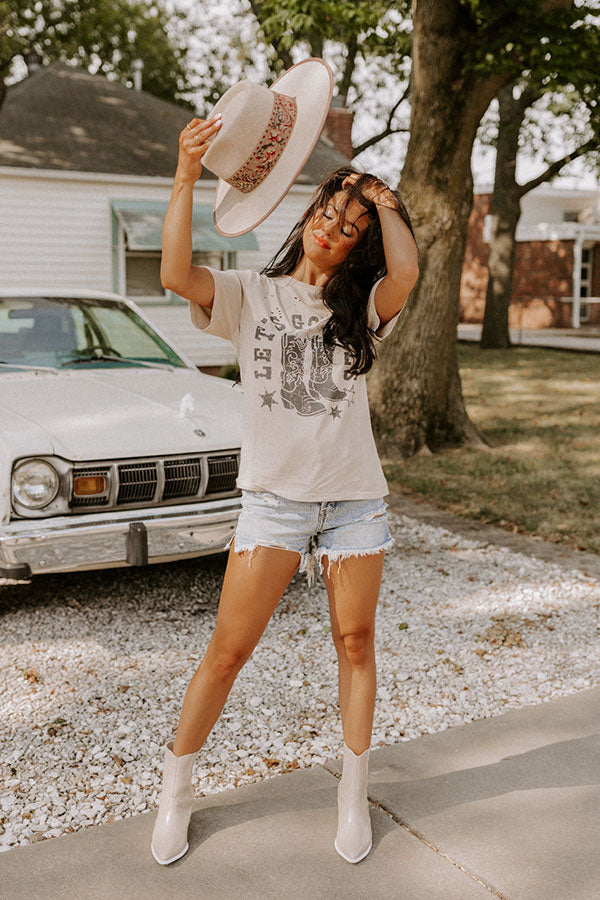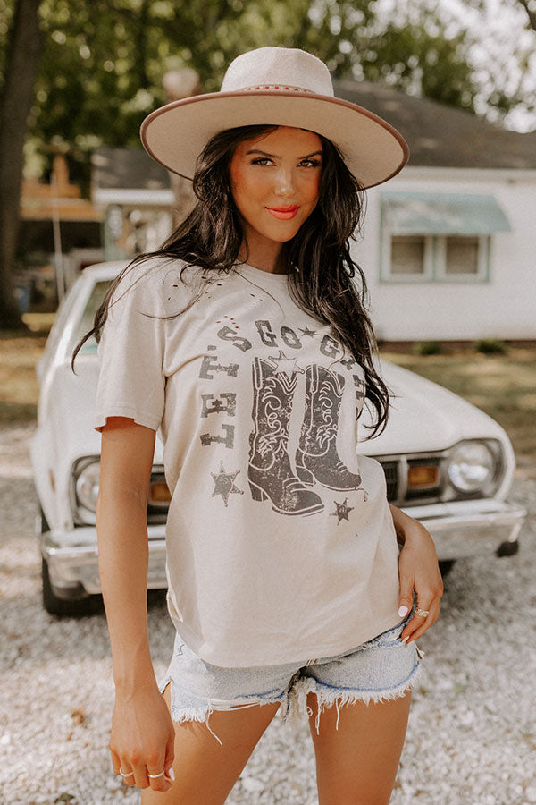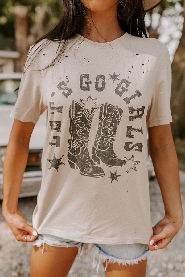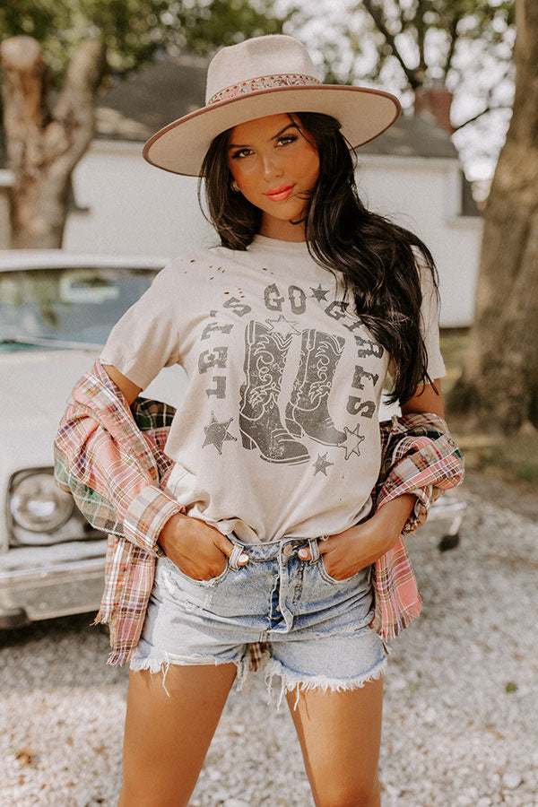 Our adorable beige hued 'Let's Go Girls' tee featuring soft lightweight material with distressed detailing, a cute cowboy boot graphic on the front, a rounded neckline, loose short sleeves, and a slouched silhouette that ends in a straight hemline!