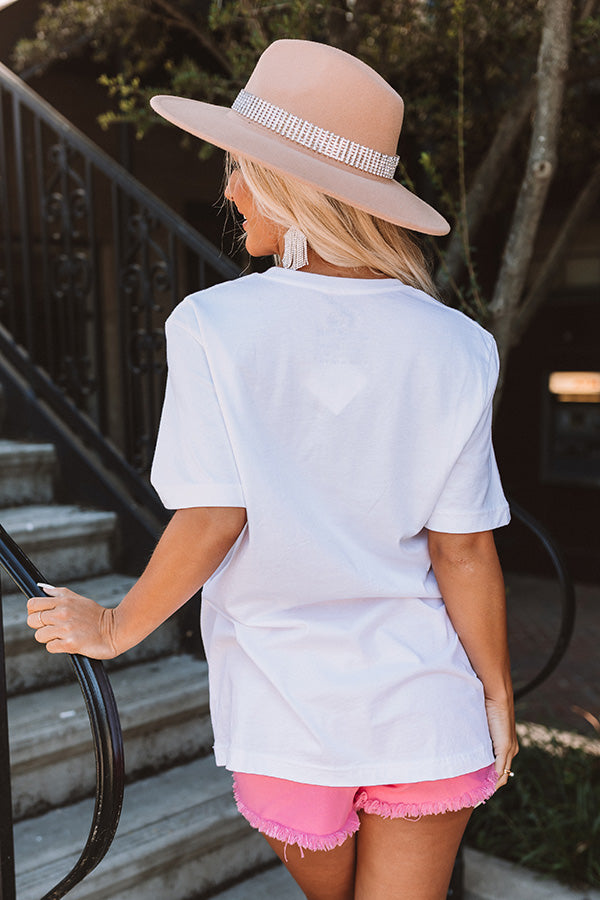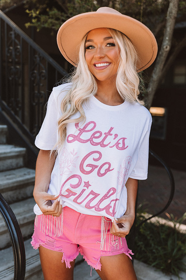 Our white 'Let's Go Girls' tee features soft lightweight material with cute pink lettering on the front, a rounded neckline, loose short sleeves, and a slouched silhouette that ends in a straight hemline!