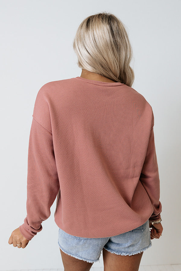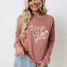 Let's go girls! Giddy up and go in this trendy dark blush hued sweatshirt featuring soft lightweight cotton blend material patterned with cute white lettering on the front, a rounded neckline, long loose sleeves with fitted cuffs, and a slouched silhouette that ends in a straight hemline! Measurements