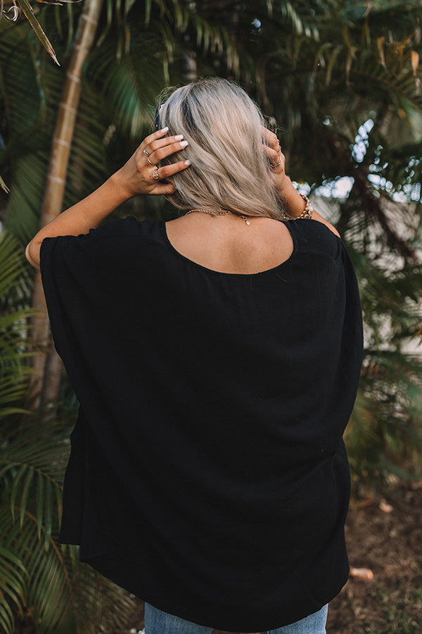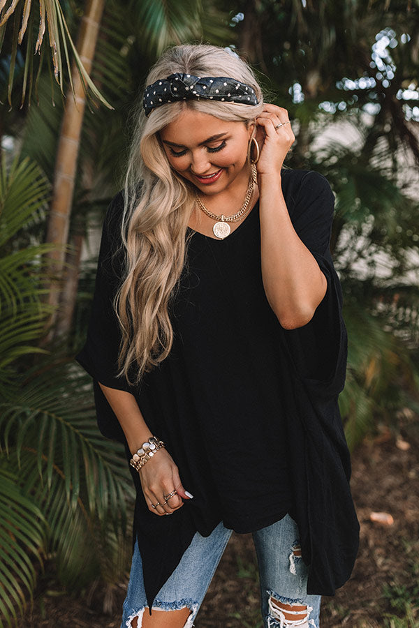 Keep your summer style casual with our cute black 'Let's Hang Out' top featuring lightweight breezy material, a wide v-cut neckline that can be worn off one shoulder, bat wing half sleeves, and an ultra draped silhouette that falls into a straight tunic-length hemline with high accent side slits! Measurements