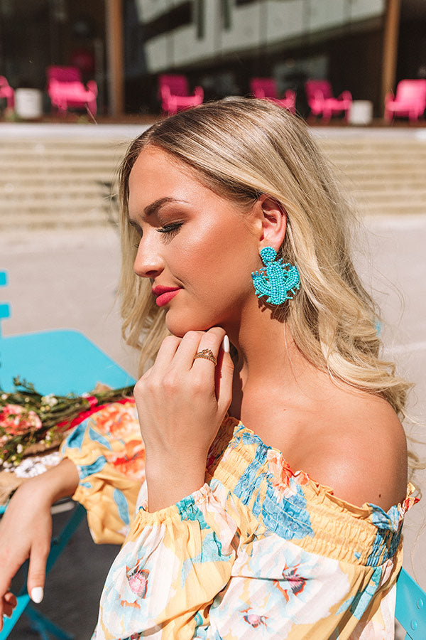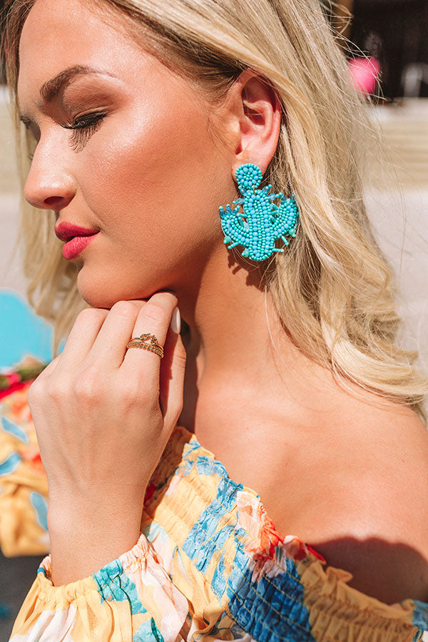 We have no doubt you will be "stuck" on how cute our turquoise "Let's Stick Together" statement earrings are with their beaded circle studs and dangling beaded cacti with fringed edge detailing!