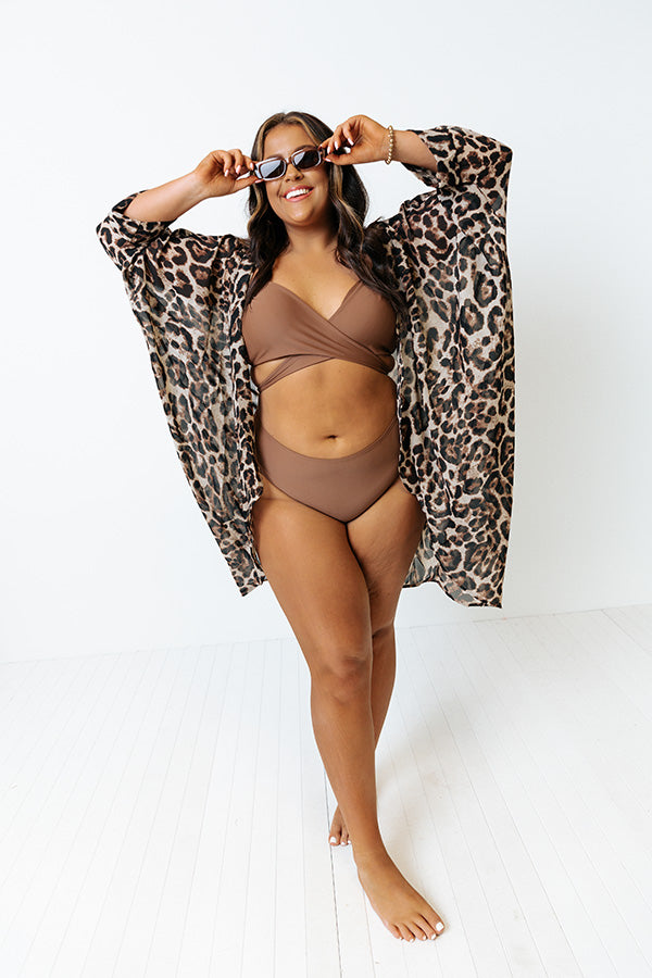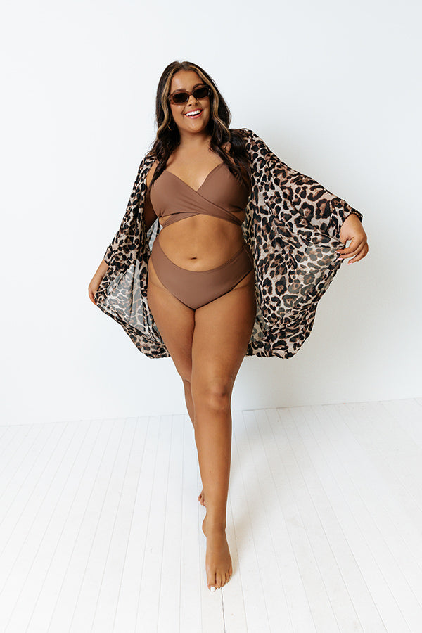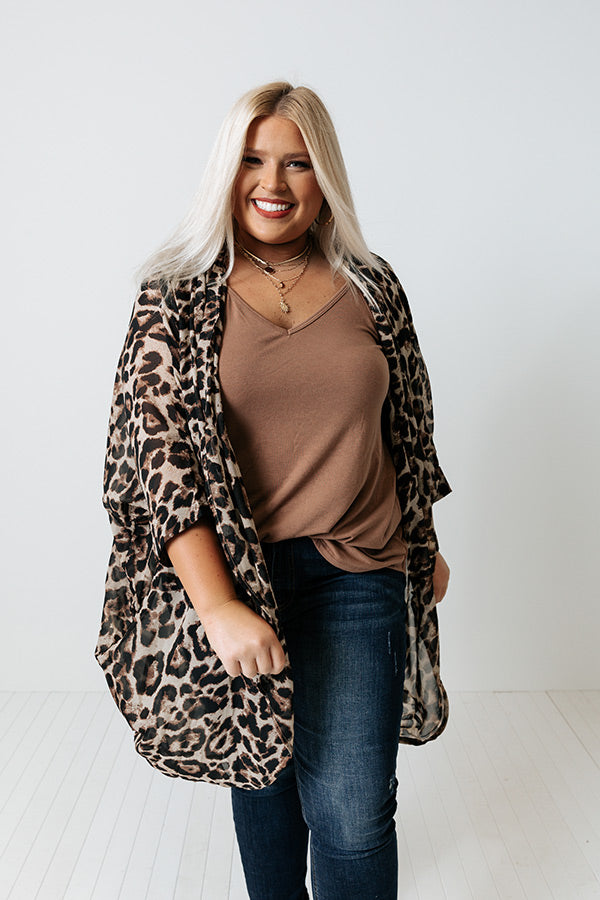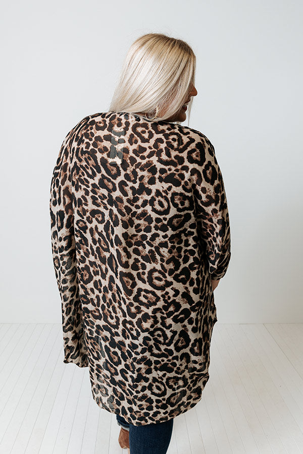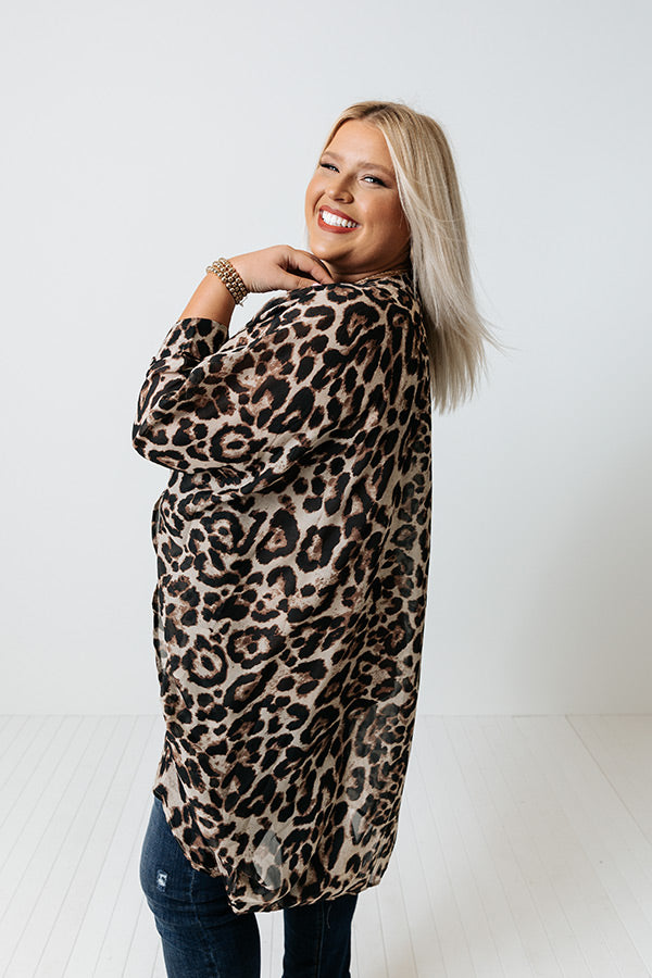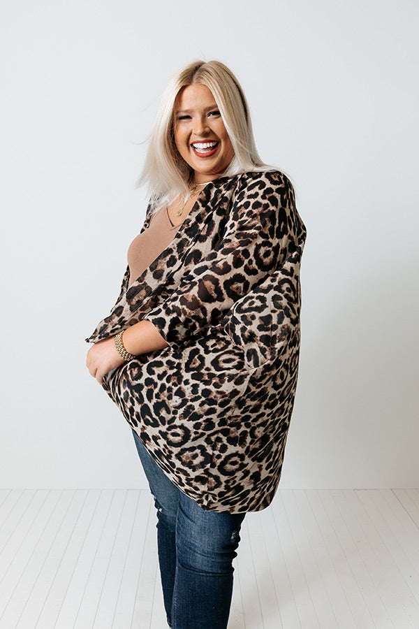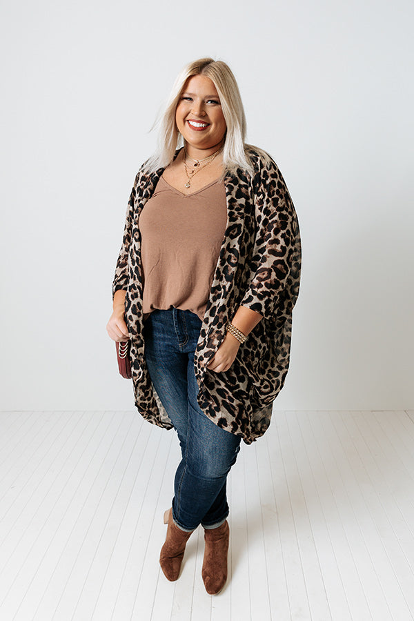 People are guaranteed to talk about how adorable this plus size birch colored overlay is with its lightweight breezy material, bod black leopard print, loose 3/4-length sleeves, and draped open-front silhouette that falls into a rounded mid-thigh length hemline!