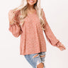 We have no doubt you will love this charming dark blush hued shift top for the rest of your life with its lightweight material, small white leopard print, a v-cut neckline and upper back, long loose sleeves with ruffled shoulder accents and elastic band cuffs, and a relaxed silhouette that ends in a straight hemline with side slits! Measurements