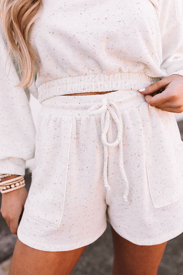 These cozy cream hued shorts are sure to lift your mood with their soft lightweight material, wide elastic waistline with a tie belt, accent side pockets, and a relaxed silhouette that ends in straight upper-thigh length hemlines!