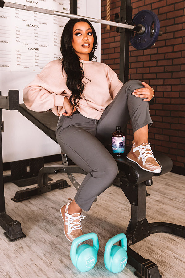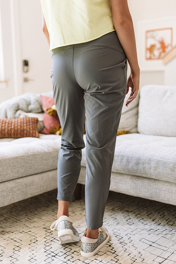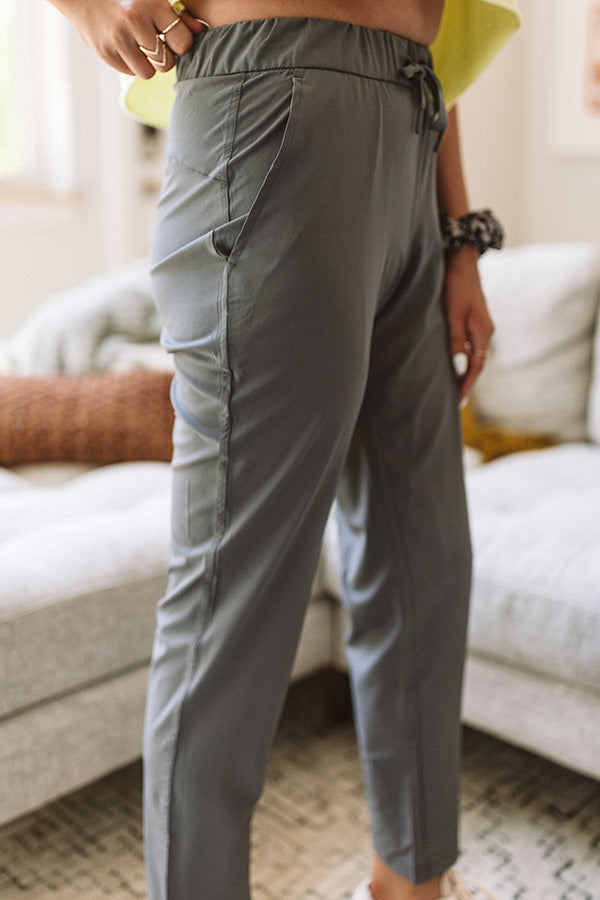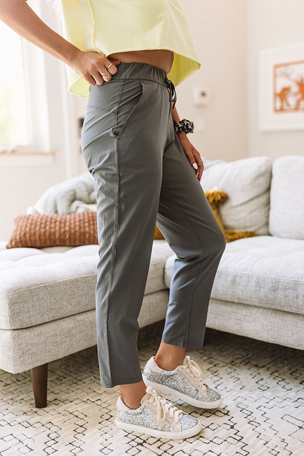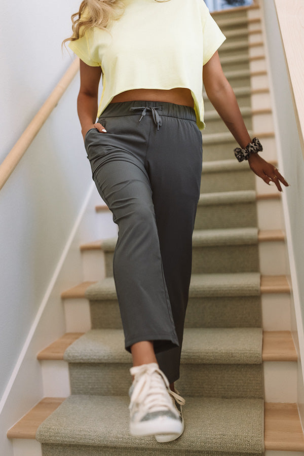 These adorable dark grey pants are guaranteed to be light and airy with their sleek lightweight material, high elastic waistline with a tie belt, accent side pockets, and a relaxed boot cut silhouette that falls into straight ankle length hemlines! Measurements