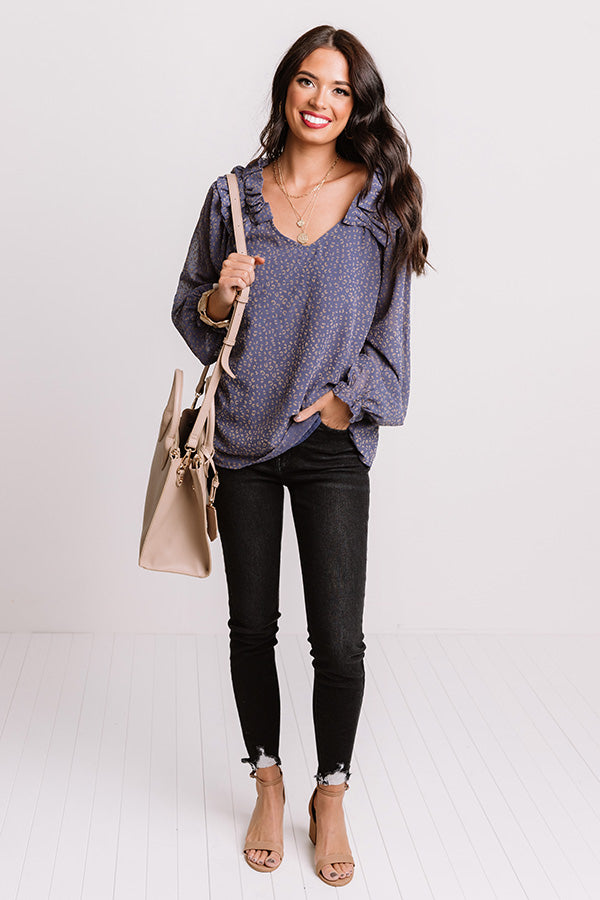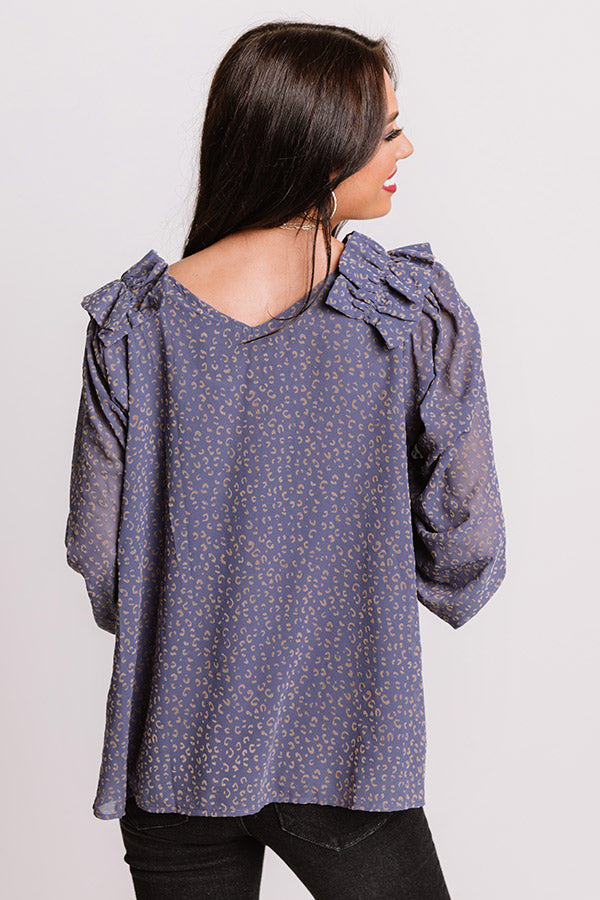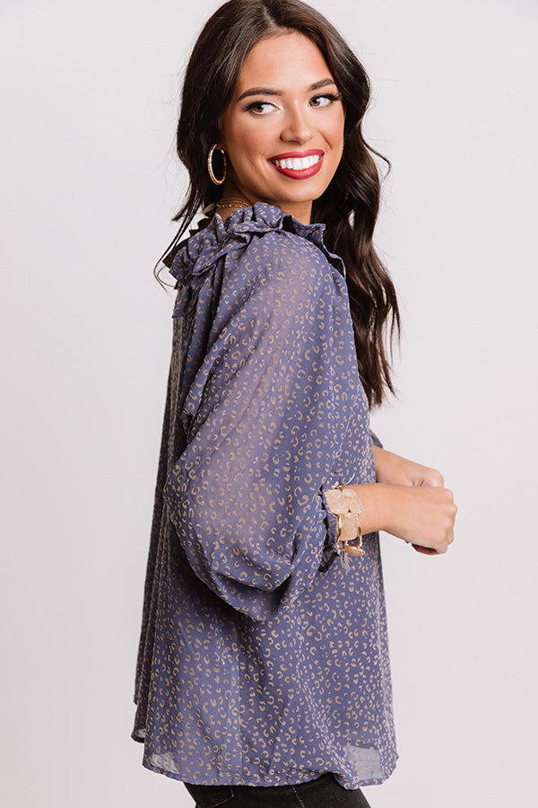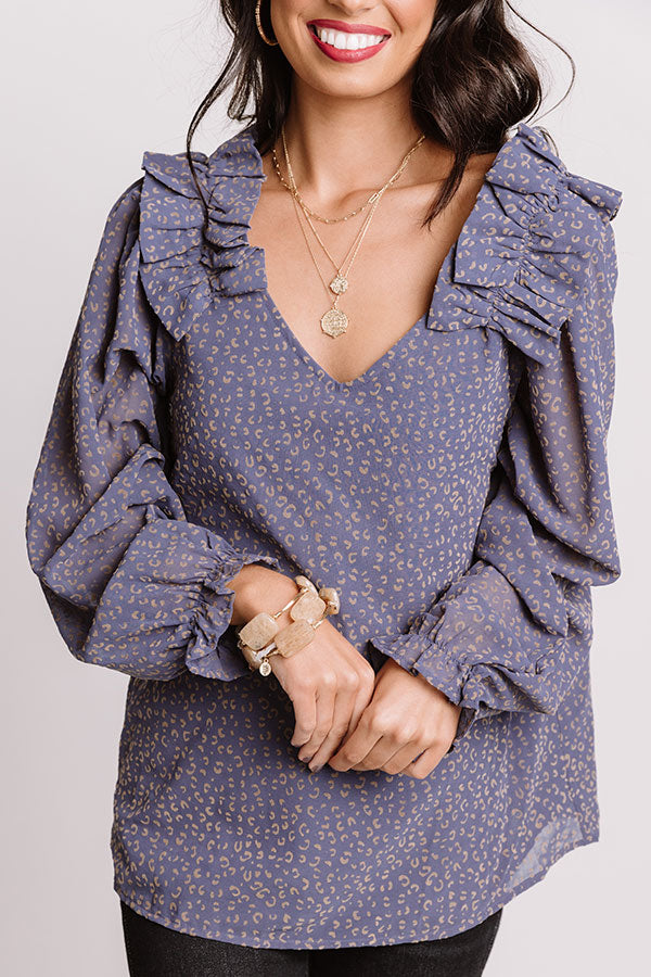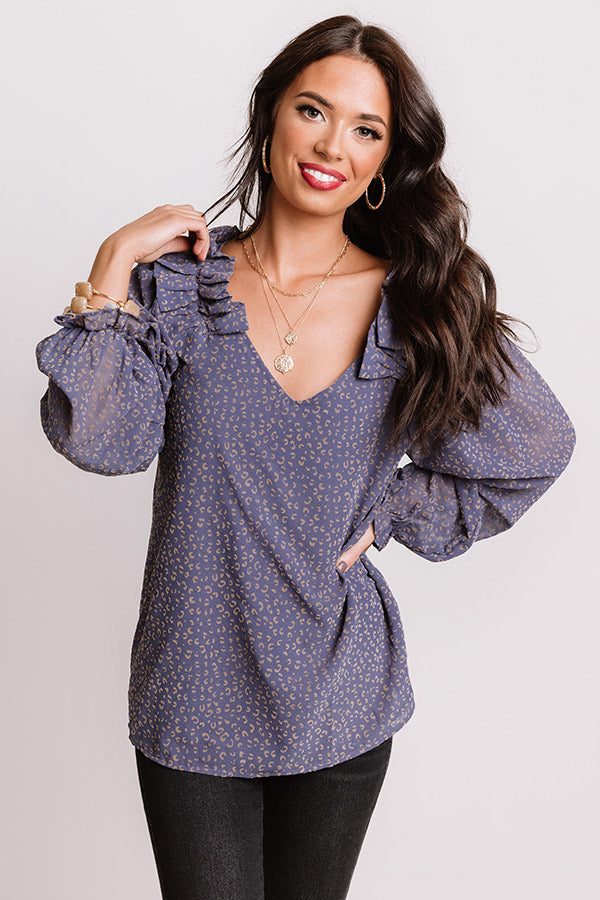 Slay all day in our charming dark periwinkle colored "Lighting Candles Shift Top" featuring lightweight material patterned with a small subtle neutral leopard print, long oversized bubble sleeves with elastic cuffs and wide ruffle detailing on the shoulders, a v-cut neckline, and a relaxed silhouette that falls into a rounded hemline! Measurements