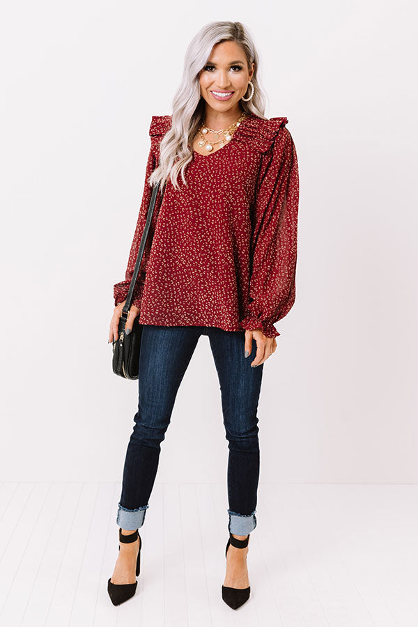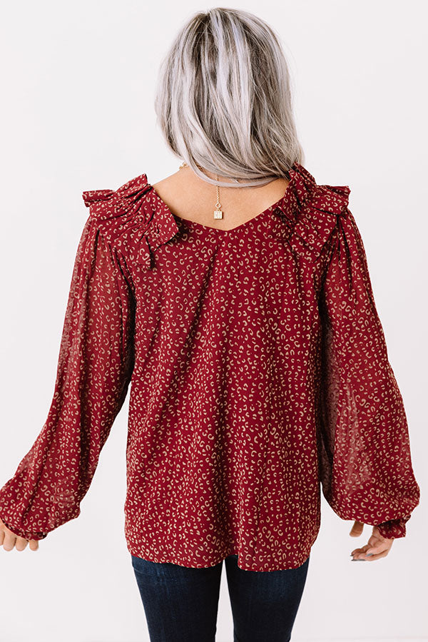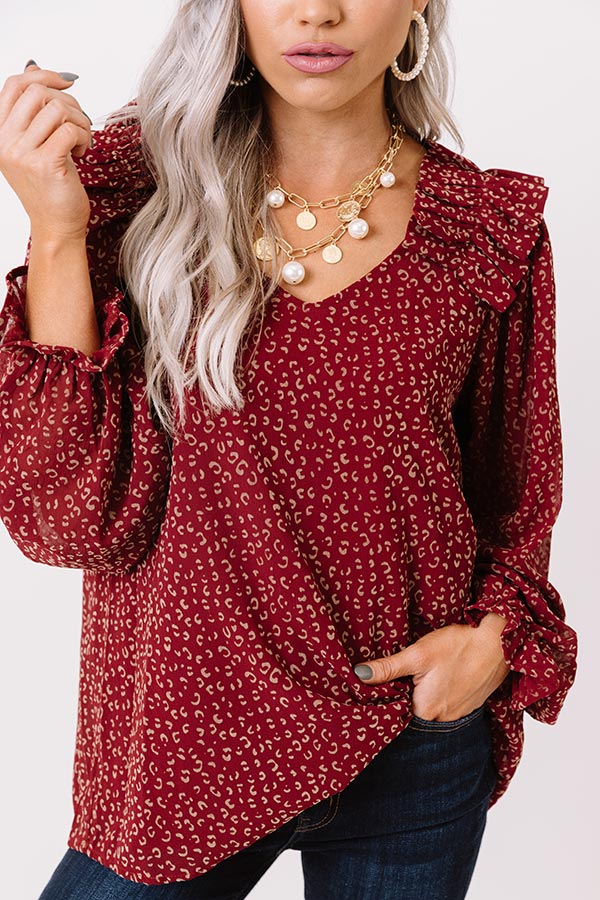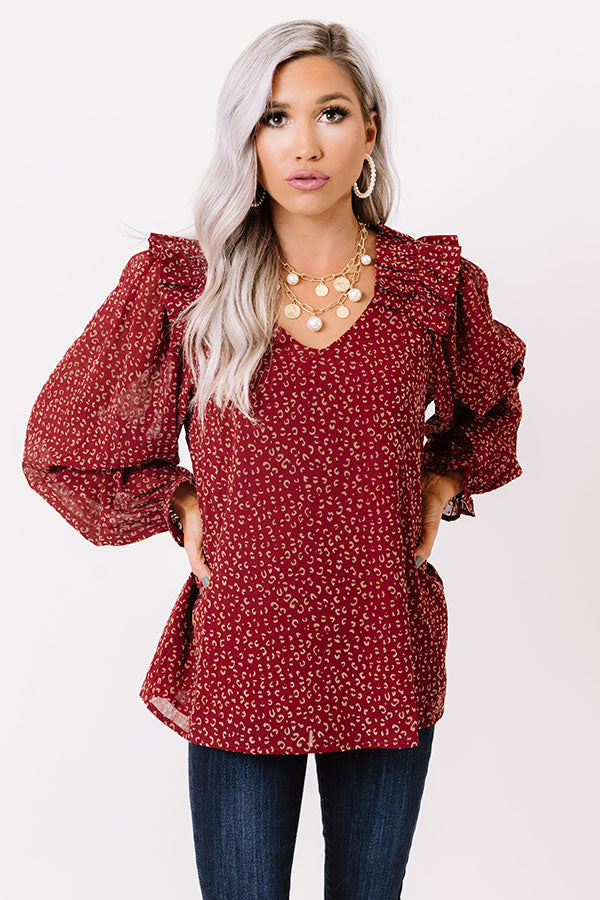 Slay all day in our charming wine colored "Lighting Candles Shift Top" featuring lightweight material patterned with a small subtle neutral leopard print, long oversized bubble sleeves with elastic cuffs and wide ruffle detailing on the shoulders, a v-cut neckline, and a relaxed silhouette that falls into a rounded hemline! Measurements