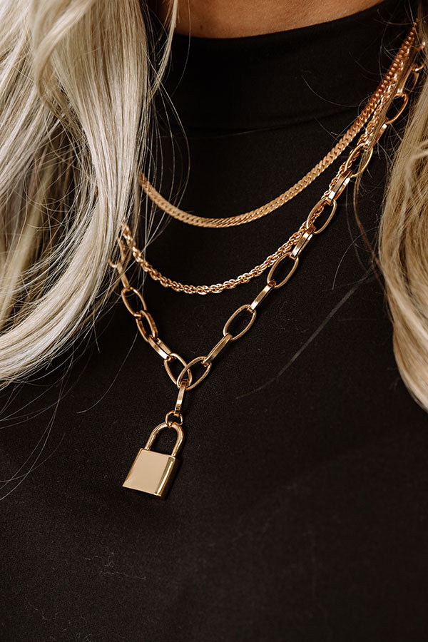 Shine bright in our adorable gold 'Lights And Smiles' necklace featuring three layered pieces: a snake chain, a tight twisted chain, and one longer large link chain with a lock pendant!