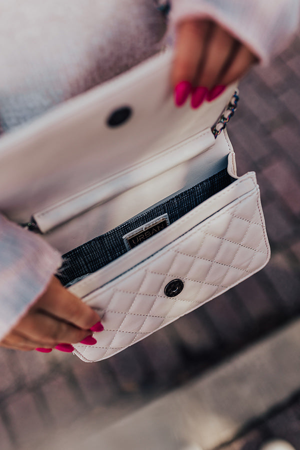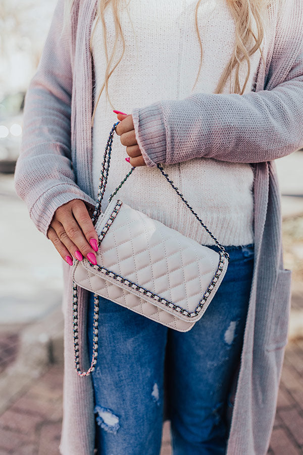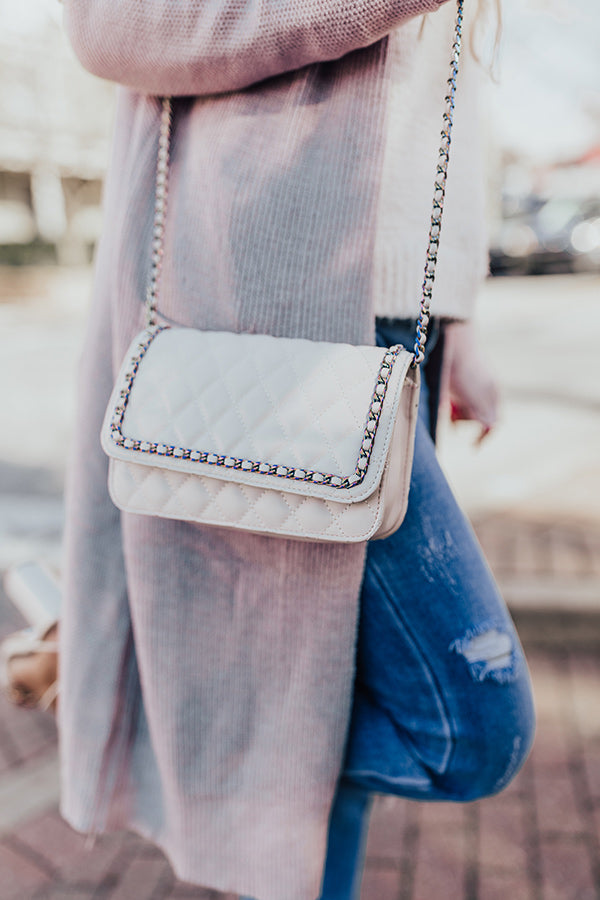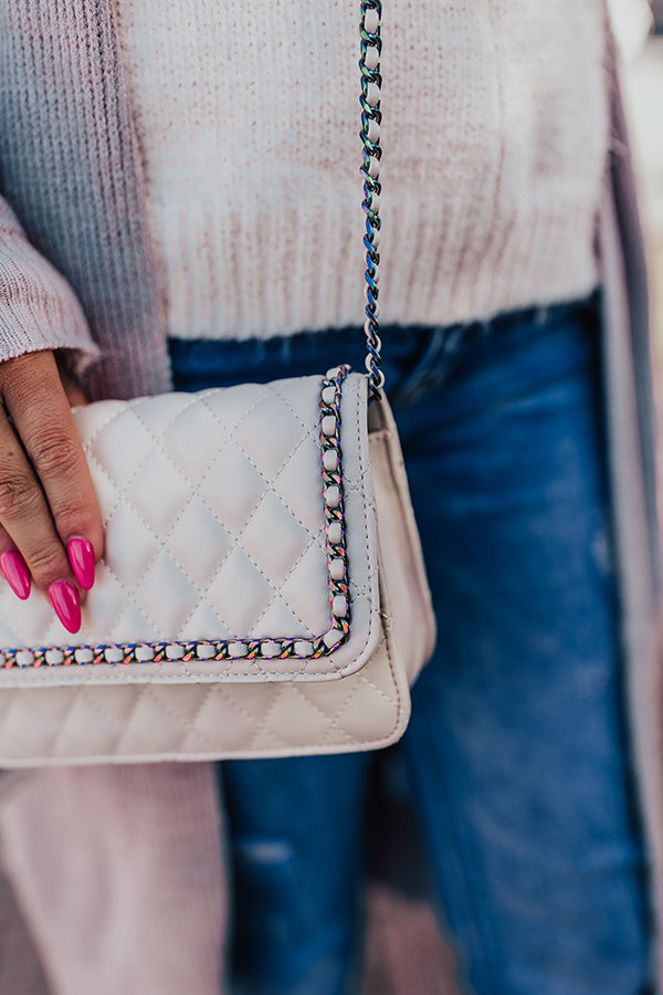 Let our rebellious side show with this adorable cream hued crossbody featuring sleek faux leather material with quilted texturing, a chain link shoulder strap, a flap closure, an additional outside back pocket, and a fully lined rectangular silhouette with an additional inside pocket!